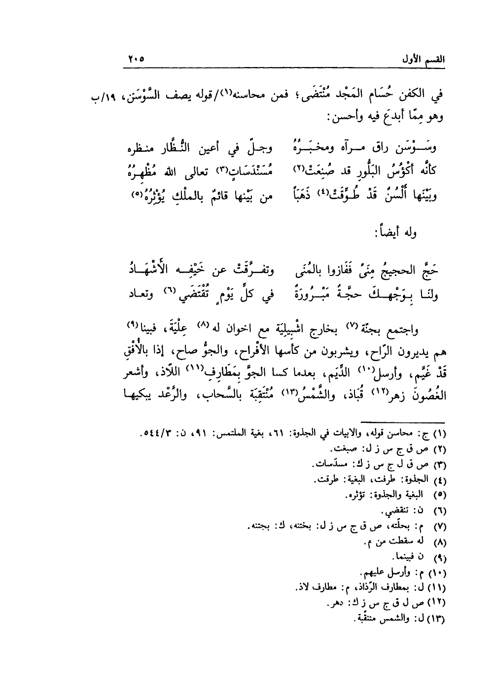 في الكفن حُسام المَجد مُنتضَى، فمن محاسنه قوله يصف السَّوسَن، وهو مِمَا أبدعَ فيه وأحسن: