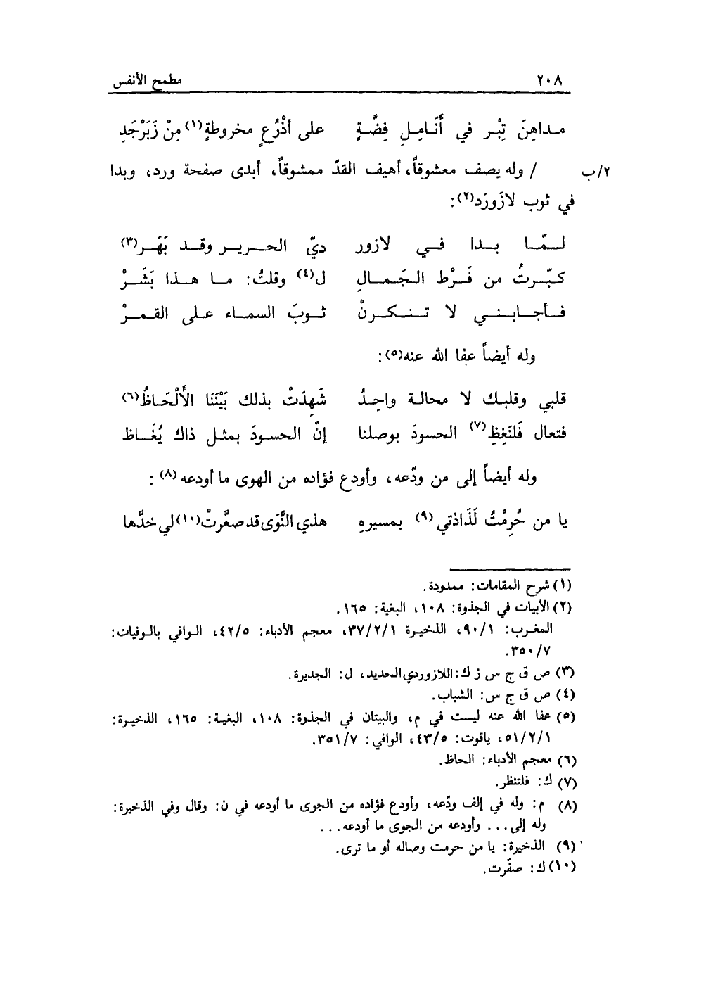 مداهِنَ تِبر في أنامِلِ فِضَّةٍ ... على أذرُعٍ مخروطةٍ مِن زَبرجَدِ