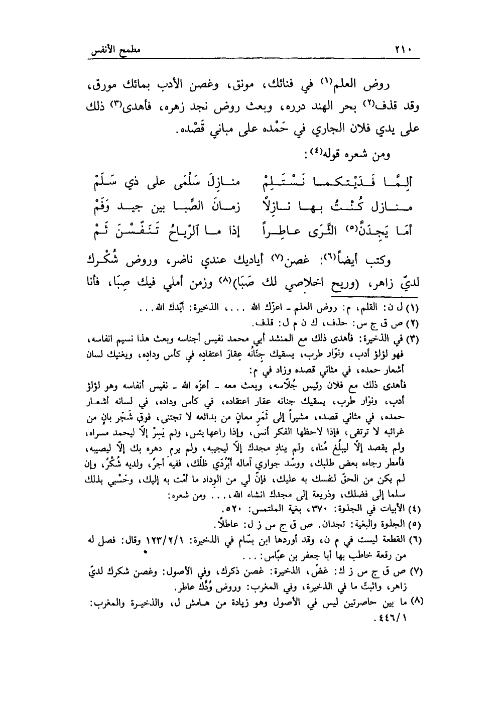 وكتب أيضاً: غصن أياديك عندي ناضر، وروض شُكرك لديّ زاهر، (وريح إخلاصي لك صَبَا) وزمن أملي فيك صِبَا، فأنا