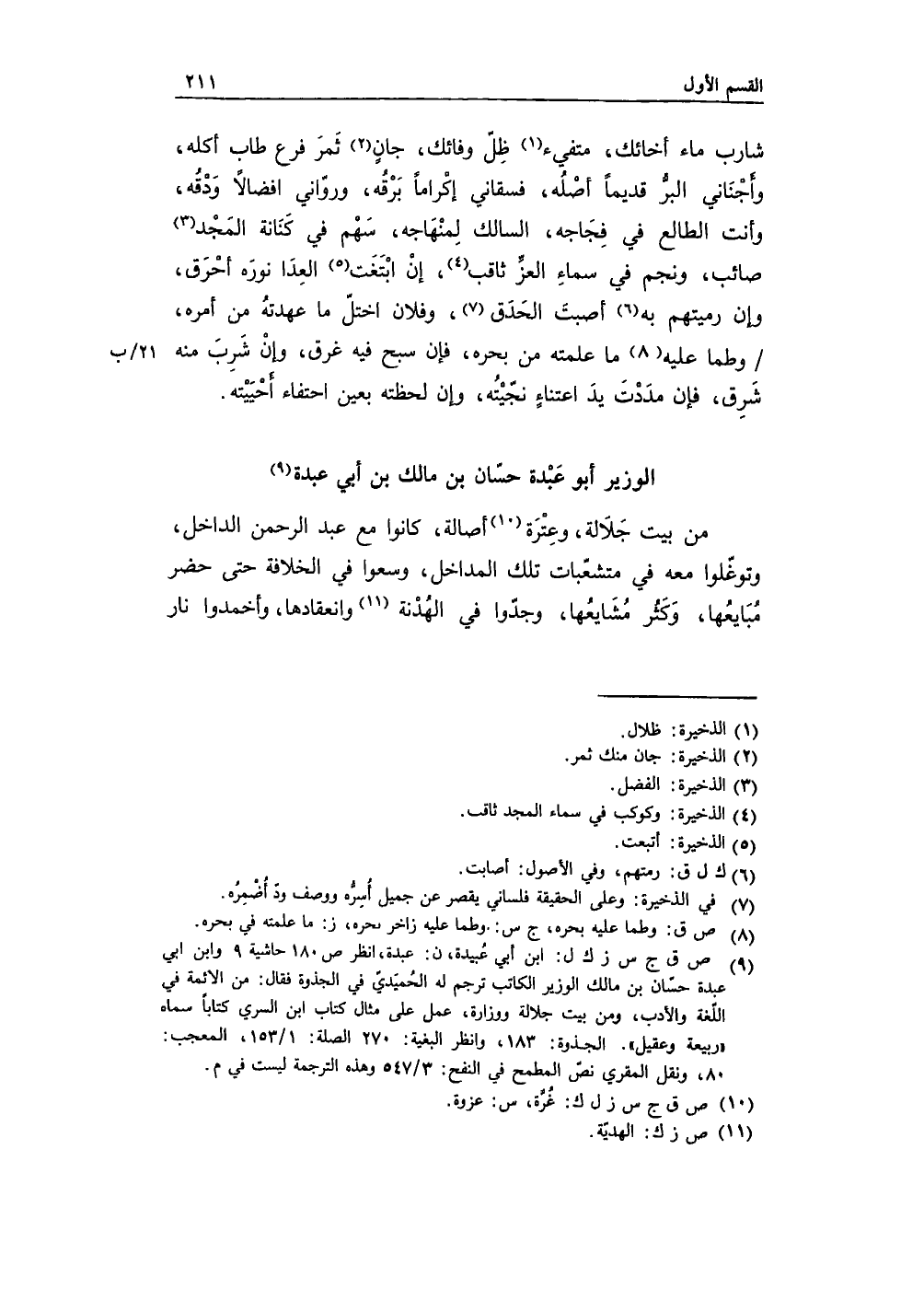 وفائك، جانٍ ثَمر فرع طاب أكله، وأجنَاني البرُّ قديماً أصلُه، فسقاني إكراماً بَرقُه، وروّاني أفضالاً وَدقُه، وأنت الطالع في فِجَاجه، السالك لِمنهَاجه، سَهم في كَنانة المَجد صائب، ونجم في سماءِ العزِّ ثاقب، إن ابتغَت العِدَا نورَه أحرَق، وإن رميتهم به أصبتَ الحَدق، وفلان اختلّ ما عهدتهُ من أمره، وطما عليه ما علمته من بحره، فإن سبح فيه غرق، وإن شَرِبَ منه شَرِق، فإن مدَدتَ يدَ اعتناءٍ نجّيتُه، وإن لحظته بعين احتفاء أحَييته.
