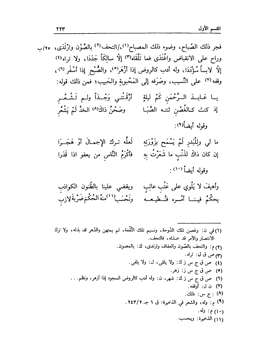هذا فجر ذلك الصباح، وضوء ذلك المصباح، التحف بالصَّون وارتدى، وراح على الانقباض واغتدى فنا تَلقاه إلاّ سالِكَاً جَددَا، ولا تراه إلاّ لابساً سُؤدَدا، وله أدب كالروض إذا أزهر، والصُّبحِ إذا أسفر، وقفه على النَّسيب، وصَرفه إلى المحبوبةِ والحبيب، فمن ذلك قوله: