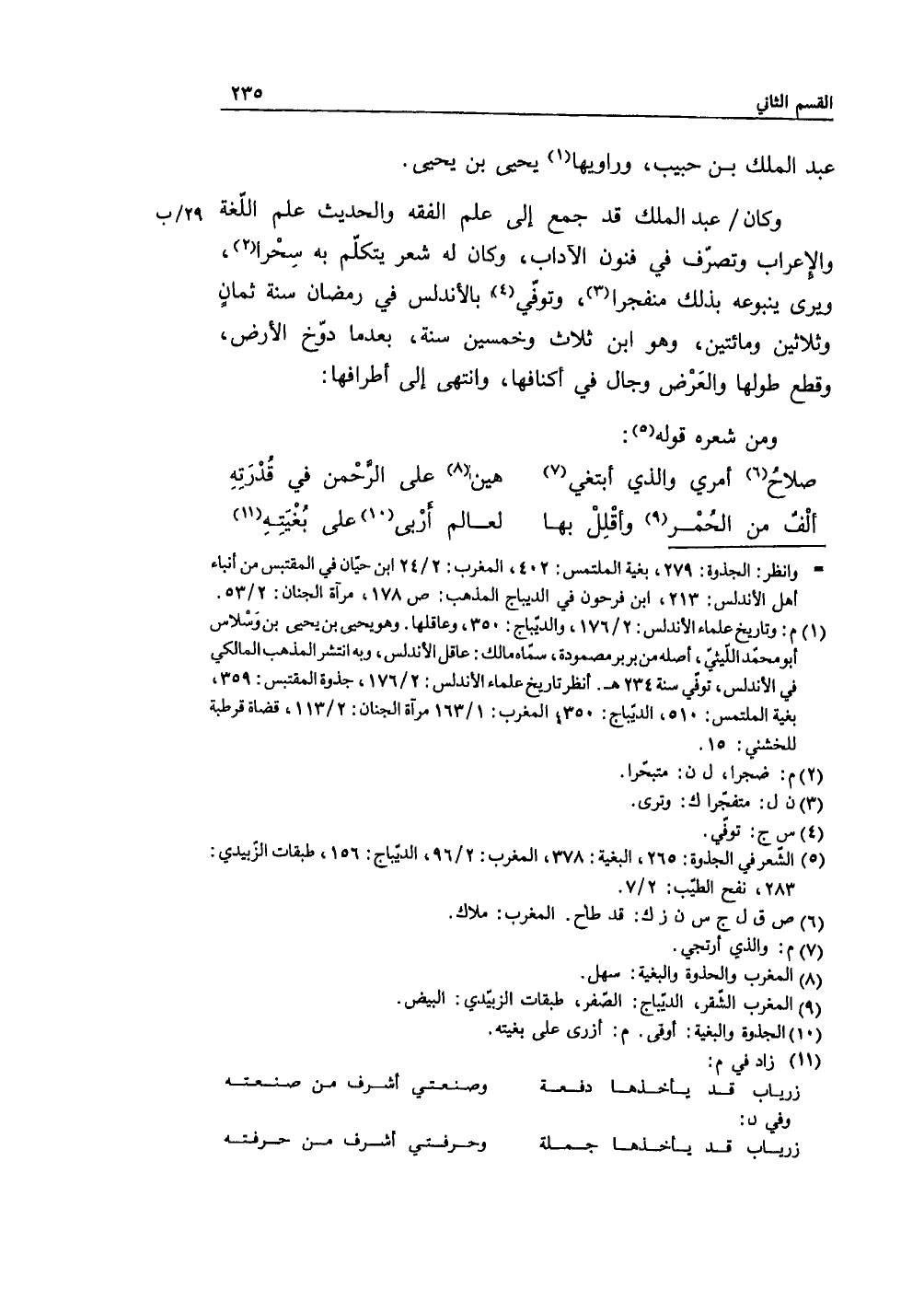 وكان عبد الملك قد جمع إلى علم الفقه والحديث علم اللّغة والإعراب وتصرّف في فنون الآداب، وكان له شعر يتكلم به سِحراً، ويرى ينبوعه بذلك منفجراً، وتوفي بالأندلس في رمضان سنة ثمانٍ وثلاثين ومائتين، وهو ابن ثلاث وخمسين سنة، بعدما دوّخ الأرض، وقطع طولها والعَرض وجال في أكنافها، وانتهى إلى