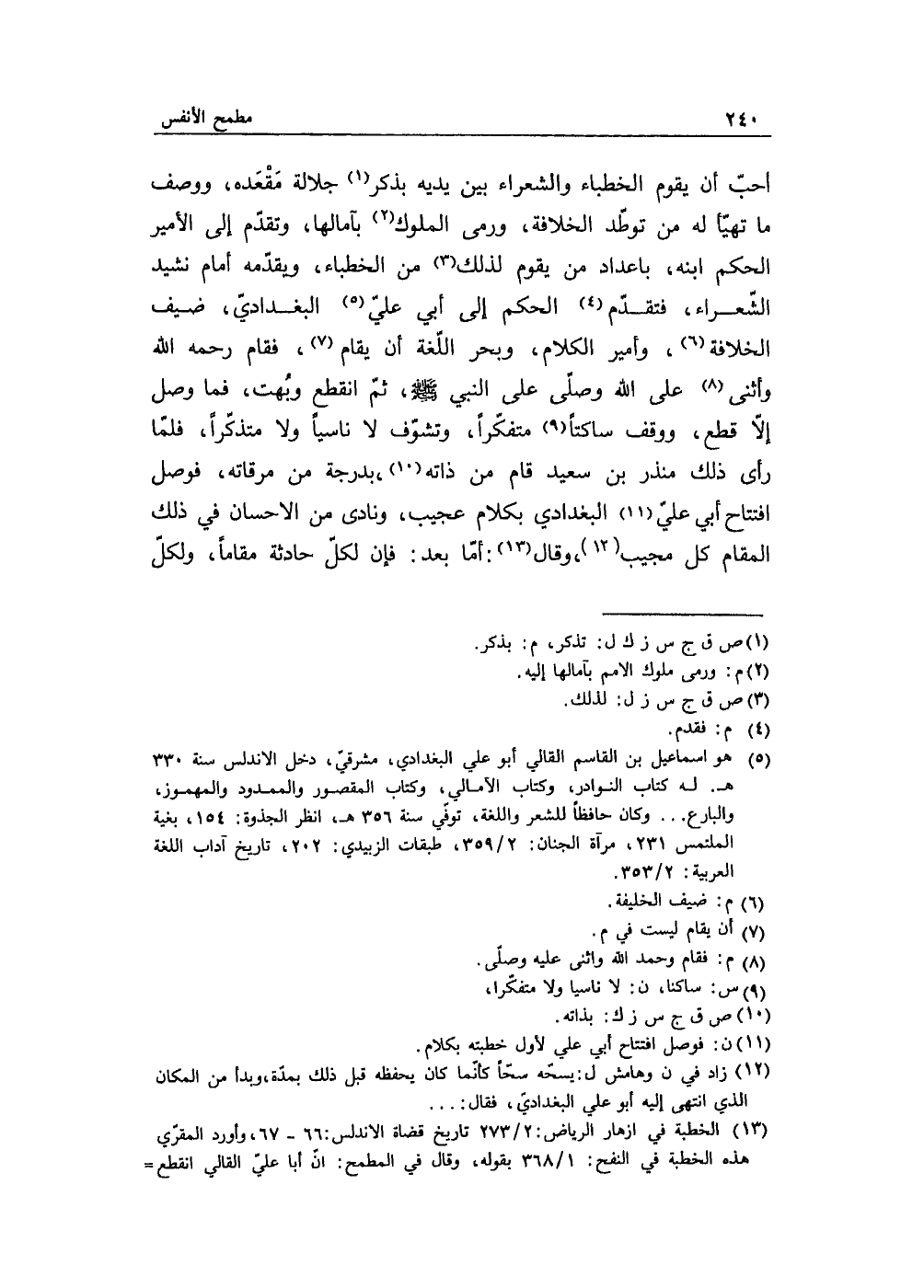 أحب أن يقوم الخطباء والشعراء بين يديه بذكر جلالة مَقعده، ووصف ما تهيأ له من توطّد الخلافة، ورمى الملوك بآمالها، وتقدم إلى الأمير الحكم ابنه، بإعداد من يقوم لذلك من الخطباء، ويقدّمه أمام نشيد الشعراء، فتقدّم الحكم إلى أبي عليّ البغداديّ، ضيف الخلافة، وأمير الكلام، وبحر اللّغة أن يقام، فقام رحمه الله وأثنى على الله وصلّى على النبي (صلى الله عليه وسلم)، ثم انقطع وبُهت، فما وصل إلاّ قطع، ووقف ساكتاً متفكّراً، وتشوّف لا ناسياً ولا متذكّراً، فلمّا رأى ذلك منذر بن سعيد قام من ذاته، بدرجة من مرقاته، فوصل افتتاح أبي عليّ البغدادي بكلام عجيب، ونادى من الإحسان في ذلك المقام كل مجيب، وقال: أما بعد، فإن لكلّ حادثة مقاماً، ولكلّ