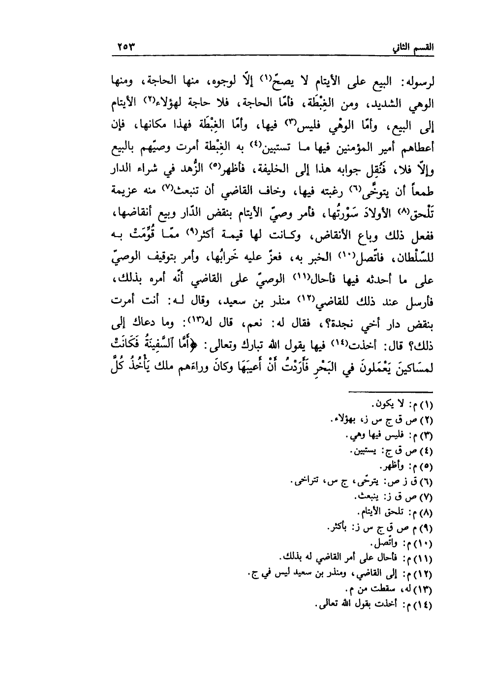لرسوله: البيع على الأيتام لا يصحّ إلا لوجوه، منها الحاجة، ومنها الوهي الشديد، ومن الغِبطَة، فأمّا الحاجة، فلا حاجة لهؤلاء الأيتام إلى البيع، وأما الوهي فليس فيها، وأما الغِبطَة فهذا مكانها، فإن أعطاهم أمير المؤمنين فيها ما تستبين به الغِبطَة أمرت وصيّهم بالبيع وإلا فلا، فنُقِل جوابه هذا إلى الخليفة، فأظهر الزُّهد في شراء الدار طمعاً أن يتوخَّى رغبته فيها، وخاف القاضي أن تنبعث منه عزيمة تلحق الأولاد سَورتها، فأمر وصيّ الأيتام بنقض الدّار وبيع أنقاضها، ففعل ذلك وباع الأنقاض، وكانت لها قيمة أكثر ممّا قُوِّمت به للسّلطان، فاتصل الخبر به، فعزّ عليه خَرابُها، وأمر بتوقيف الوصيّ على ما أحدثه فيها فأحال الوصي على القاضي أنه أمره بذلك، فأرسل عند ذلك للقاضي منذر بن سعيد، وقال له: أنت أمرت بنقض دار أخي نَجدة؟ فقال له: نعم، قال له: وما دعاك إلى ذلك قال: أخذت فيها بقول الله تبارك وتعالى: (أمَّا السَّفِينَةُ فَكَانتْ لمسَاكينَ يَعمَلونَ في البَحرِ فَأرَدْتُ أَنْ أَعيبَهَا وكانَ وراءَهم ملك يَأخُذُ كُلَّ