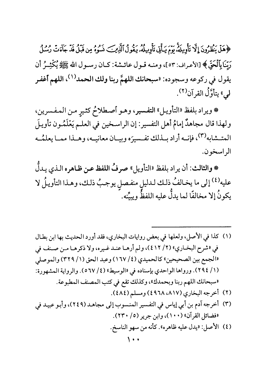 {هَلْ يَنْظُرُونَ إِلَّا تَأْوِيلَهُ يَوْمَ يَأْتِي تَأْوِيلُهُ يَقُولُ الَّذِينَ نَسُوهُ مِنْ قَبْلُ قَدْ جَاءَتْ رُسُلُ رَبِّنَا بِالْحَقِّ} [الأعراف: ٥٣] , ومنه قول عائشة: كان رسول الله - صلى الله عليه وسلم - يُكْثِرُ أن يقول في ركوعه وسجوده: «سبحانك اللهمَّ ربنا ولك الحمد (¬١)، اللهم اغفر لي» يتأوَّلُ القرآن (¬٢).