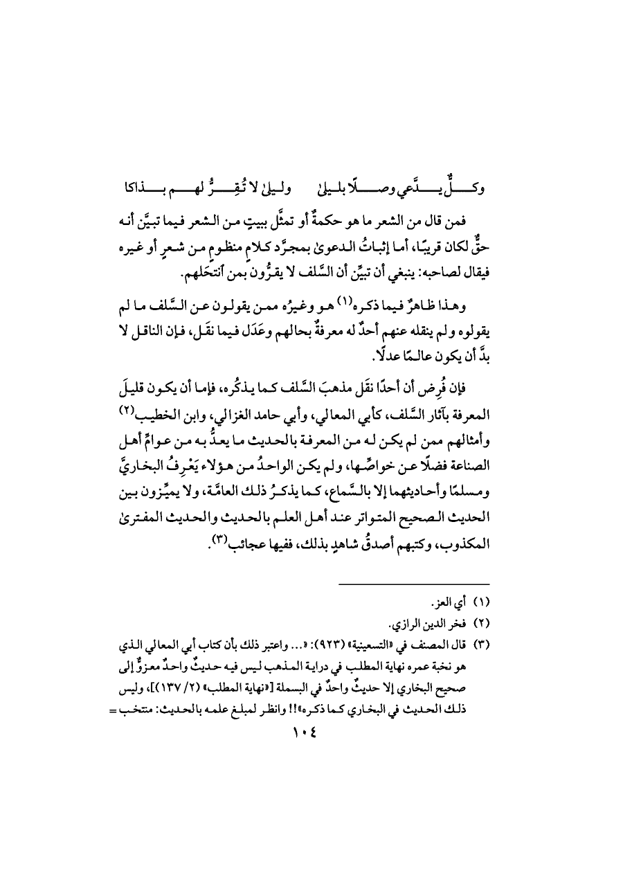فإن فُرِض أن أحدًا نقَل مذهبَ السَّلف كما يذكُره، فإما أن يكون قليلَ المعرفة بآثار السَّلف، كأبي المعالي, وأبي حامد الغزالي, وابن الخطيب (¬٢) وأمثالهم ممن لم يكن له من المعرفة بالحديث ما يعدُّ به من عوامِّ أهل الصناعة فضلًا عن خواصِّها، ولم يكن الواحدُ من هؤلاء يَعْرِفُ البخاريَّ ومسلمًا وأحاديثهما إلا بالسَّماع، كما يذكرُ ذلك العامَّة، ولا يميِّزون بين الحديث الصحيح المتواتر عند أهل العلم بالحديث والحديث المفترى المكذوب، وكتبهم أصدقُ شاهدٍ بذلك, ففيها عجائب (¬٣).