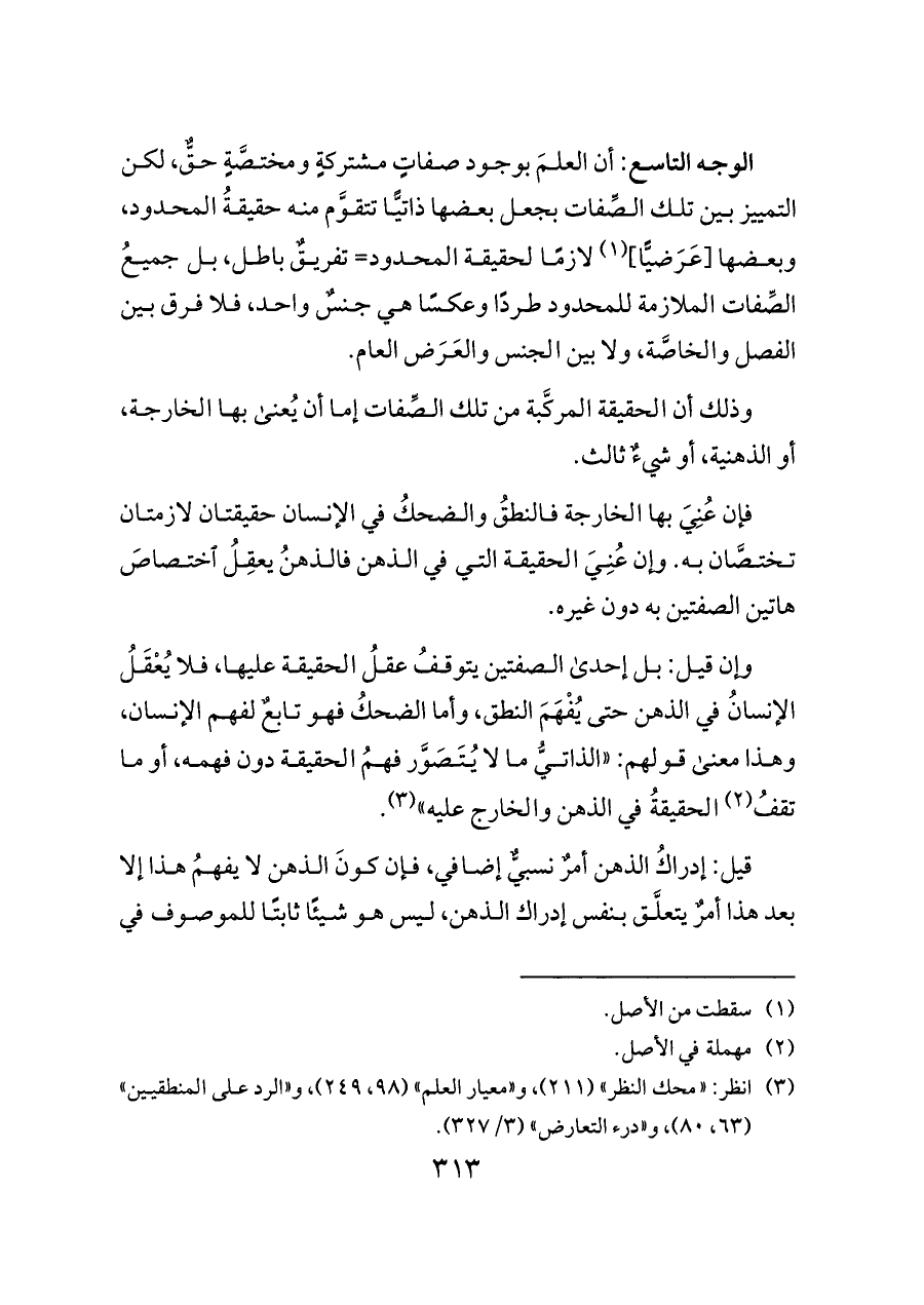 الوجه التاسع: أن العلمَ بوجود صفاتٍ مشتركةٍ ومختصَّةٍ حقٌّ، لكن التمييز بين تلك الصِّفات بجعل بعضها ذاتيًّا تتقوَّم منه حقيقةُ المحدود، وبعضها [عَرَضيًّا] (¬١) لازمًا لحقيقة المحدود= تفريقٌ باطل، بل جميعُ الصِّفات الملازمة للمحدود طردًا وعكسًا هي جنسٌ واحد، فلا فرق بين الفصل والخاصَّة، ولا بين الجنس والعَرَض العام.