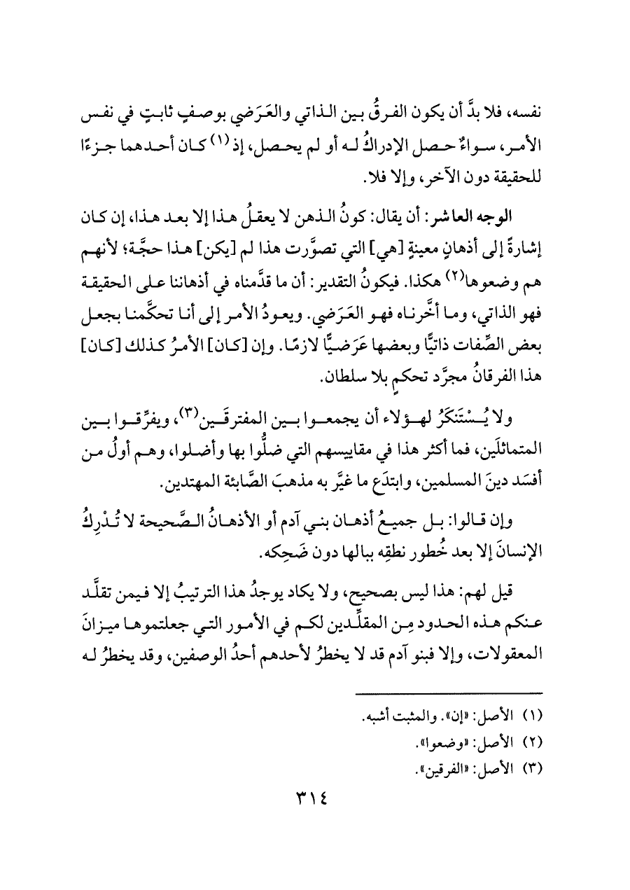 الوجه العاشر: أن يقال: كونُ الذهن لا يعقلُ هذا إلا بعد هذا، إن كان إشارةً إلى أذهانٍ معينةٍ [هي] التي تصوَّرت هذا لم [يكن] هذا حجَّة؛ لأنهم هم وضعوها (¬٢) هكذا. فيكونُ التقدير: أن ما قدَّمناه في أذهاننا على الحقيقة فهو الذاتي، وما أخَّرناه فهو العَرَضي. ويعودُ الأمر إلى أنا تحكَّمنا بجعل بعض الصِّفات ذاتيًّا وبعضها عَرَضيًّا لازمًا. وإن [كان] الأمرُ كذلك [كان] هذا الفرقانُ مجرَّد تحكمٍ بلا سلطان.
