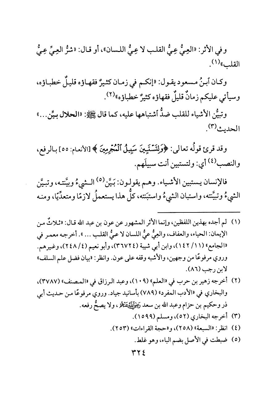 (¬١). لم أجده بهذين اللفظين, وإنما الأثر المشهور عن عون بن عبد الله قال: «ثلاثٌ من الإيمان: الحياء، والعفاف، والعِيُّ عيُّ اللسان لا عيُّ القلب ... ». أخرجه معمر في «الجامع» (١١/ ١٤٢) , وابن أبي شيبة (٣٦٧٢٤) , وأبو نعيم (٤/ ٢٤٨) , وغيرهم. وروي مرفوعًا من وجهين, والأشبه وقفه على عون. وانظر: «بيان فضل علم السلف» لابن رجب (٨٦).
