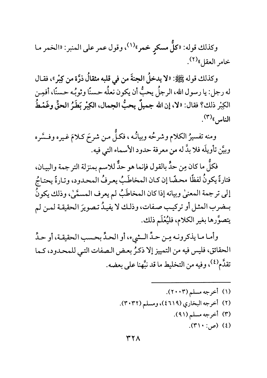 ومنه تفسيرُ الكلام وشرحُه وبيانُه , فكلُّ من شرحَ كلامَ غيره وفسَّره وبيَّن تأويلَه فلا بدَّ له من معرفة حدود الأسماء التي فيه.