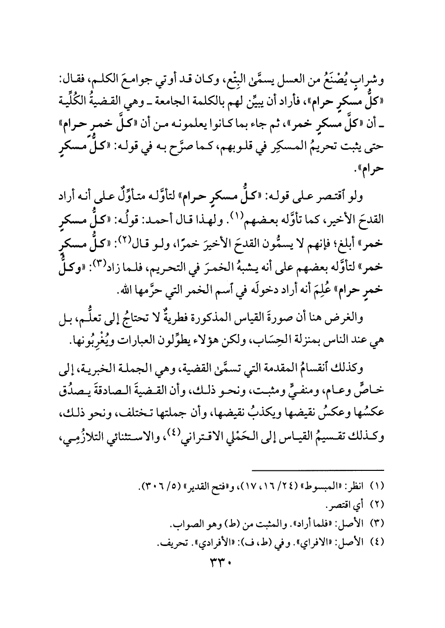 وشرابٍ يُصْنَعُ من العسل يسمَّى البِتْع، وكان قد أوتي جوامعَ الكلم، فقال: «كلُّ مسكرٍ حرام» , فأراد أن يبيِّن لهم بالكلمة الجامعة ــ وهي القضيةُ الكُلِّية ــ أن «كلَّ مسكرٍ خمر»، ثم جاء بما كانوا يعلمونه من أن «كلَّ خمرٍ حرام» حتى يثبت تحريمُ المسكِر في قلوبهم، كما صرَّح به في قوله: «كلُّ مسكرٍ حرام».