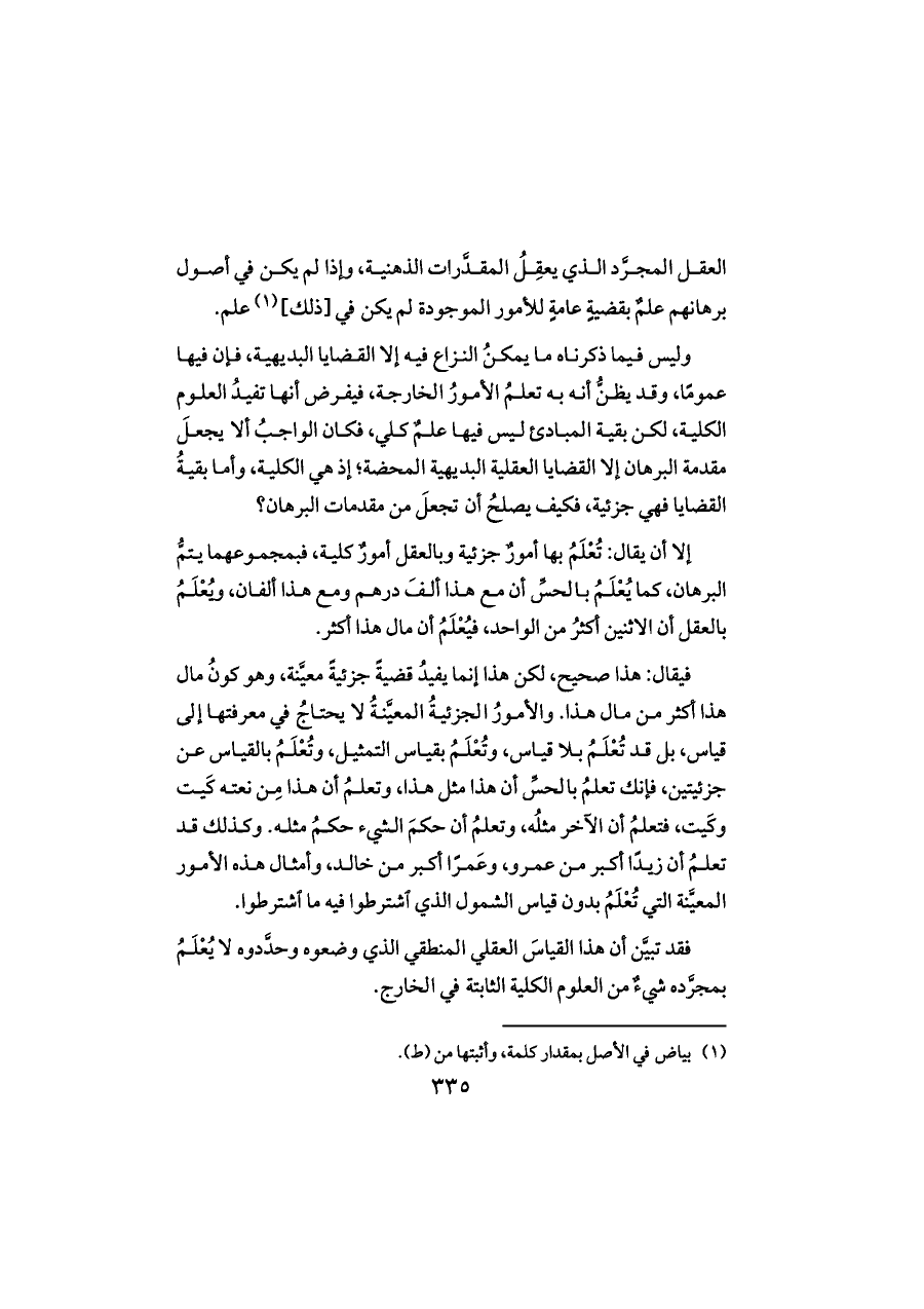 وليس فيما ذكرناه ما يمكنُ النزاع فيه إلا القضايا البديهية، فإن فيها عمومًا، وقد يظنُّ أنه به تعلمُ الأمورُ الخارجة، فيفرض أنها تفيدُ العلوم الكلية، لكن بقية المبادئ ليس فيها علمٌ كلي, فكان الواجبُ ألا يجعلَ مقدمة البرهان إلا القضايا العقلية البديهية المحضة؛ إذ هي الكلية, وأما بقيةُ القضايا فهي جزئية، فكيف يصلحُ أن تجعلَ من مقدمات البرهان؟