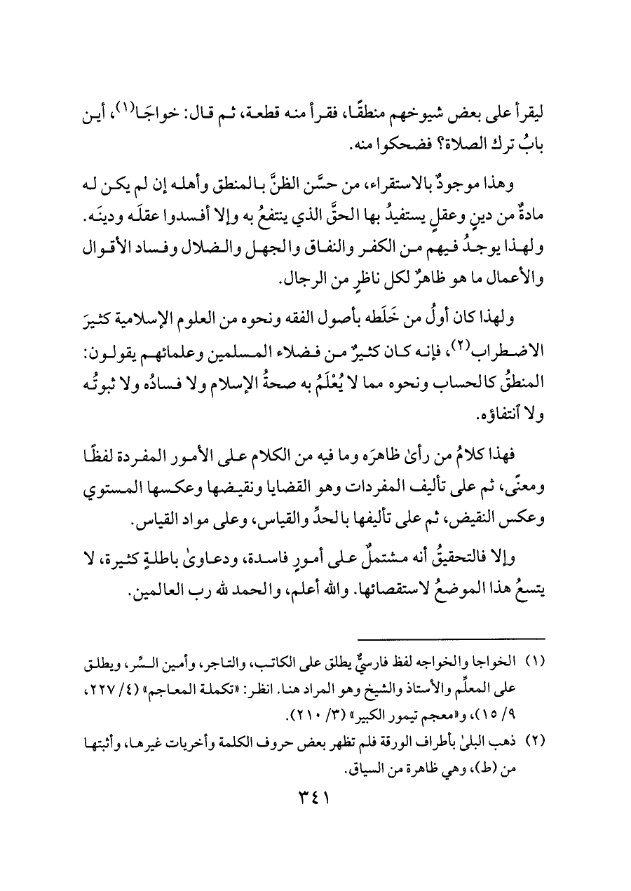 وهذا موجودٌ بالاستقراء, من حسَّن الظنَّ بالمنطق وأهله إن لم يكن له مادةٌ من دينٍ وعقلٍ يستفيدُ بها الحقَّ الذي ينتفعُ به وإلا أفسدوا عقلَه ودينَه. ولهذا يوجدُ فيهم من الكفر والنفاق والجهل والضلال وفساد الأقوال والأعمال ما هو ظاهرٌ لكل ناظرٍ من الرجال.