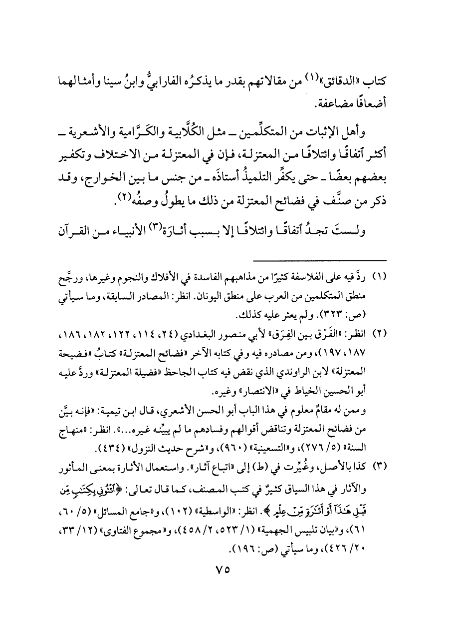 كتاب «الدقائق» (¬١) من مقالاتهم بقدر ما يذكرُه الفارابيُّ وابنُ سينا وأمثالهما أضعافًا مضاعفة.