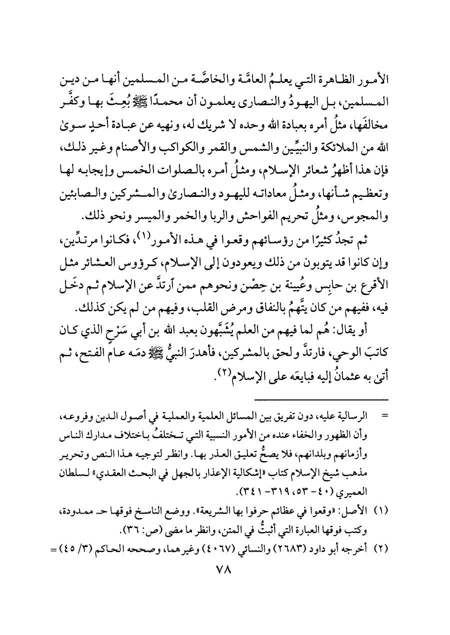 الأمور الظاهرة التي يعلمُ العامَّة والخاصَّة من المسلمين أنها من دين المسلمين، بل اليهودُ والنصارى يعلمون أن محمدًا - صلى الله عليه وسلم - بُعِثَ بها وكفَّر مخالفَها، مثلُ أمره بعبادة الله وحده لا شريك له، ونهيه عن عبادة أحدٍ سوى الله من الملائكة والنبيِّين والشمس والقمر والكواكب والأصنام وغير ذلك، فإن هذا أظهرُ شعائر الإسلام، ومثلُ أمره بالصلوات الخمس وإيجابه لها وتعظيم شأنها، ومثلُ معاداته لليهود والنصارى والمشركين والصابئين والمجوس، ومثلُ تحريم الفواحش والربا والخمر والميسر ونحو ذلك.