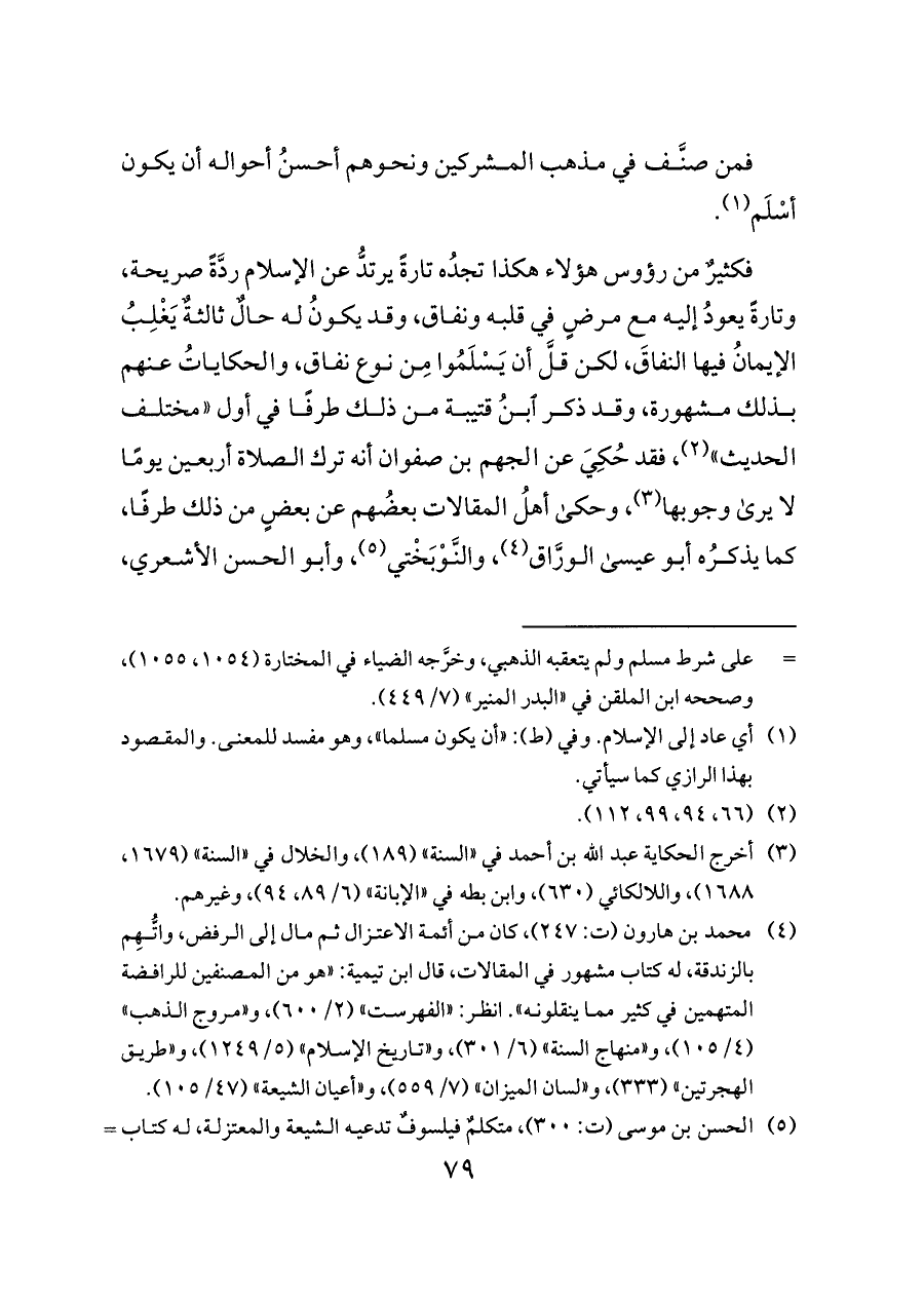 فكثيرٌ من رؤوس هؤلاء هكذا تجدُه تارةً يرتدُّ عن الإسلام ردَّةً صريحة، وتارةً يعودُ إليه مع مرضٍ في قلبه ونفاق، وقد يكونُ له حالٌ ثالثةٌ يَغْلِبُ الإيمانُ فيها النفاقَ، لكن قلَّ أن يَسْلَمُوا مِن نوع نفاق، والحكاياتُ عنهم بذلك مشهورة, وقد ذكر ابنُ قتيبة من ذلك طرفًا في أول «مختلف الحديث» (¬٢)، فقد حُكِيَ عن الجهم بن صفوان أنه ترك الصلاة أربعين يومًا لا يرى وجوبها (¬٣)، وحكى أهلُ المقالات بعضُهم عن بعضٍ من ذلك طرفًا، كما يذكرُه أبو عيسى الورَّاق (¬٤) , والنَّوْبَخْتي (¬٥) , وأبو الحسن الأشعري,