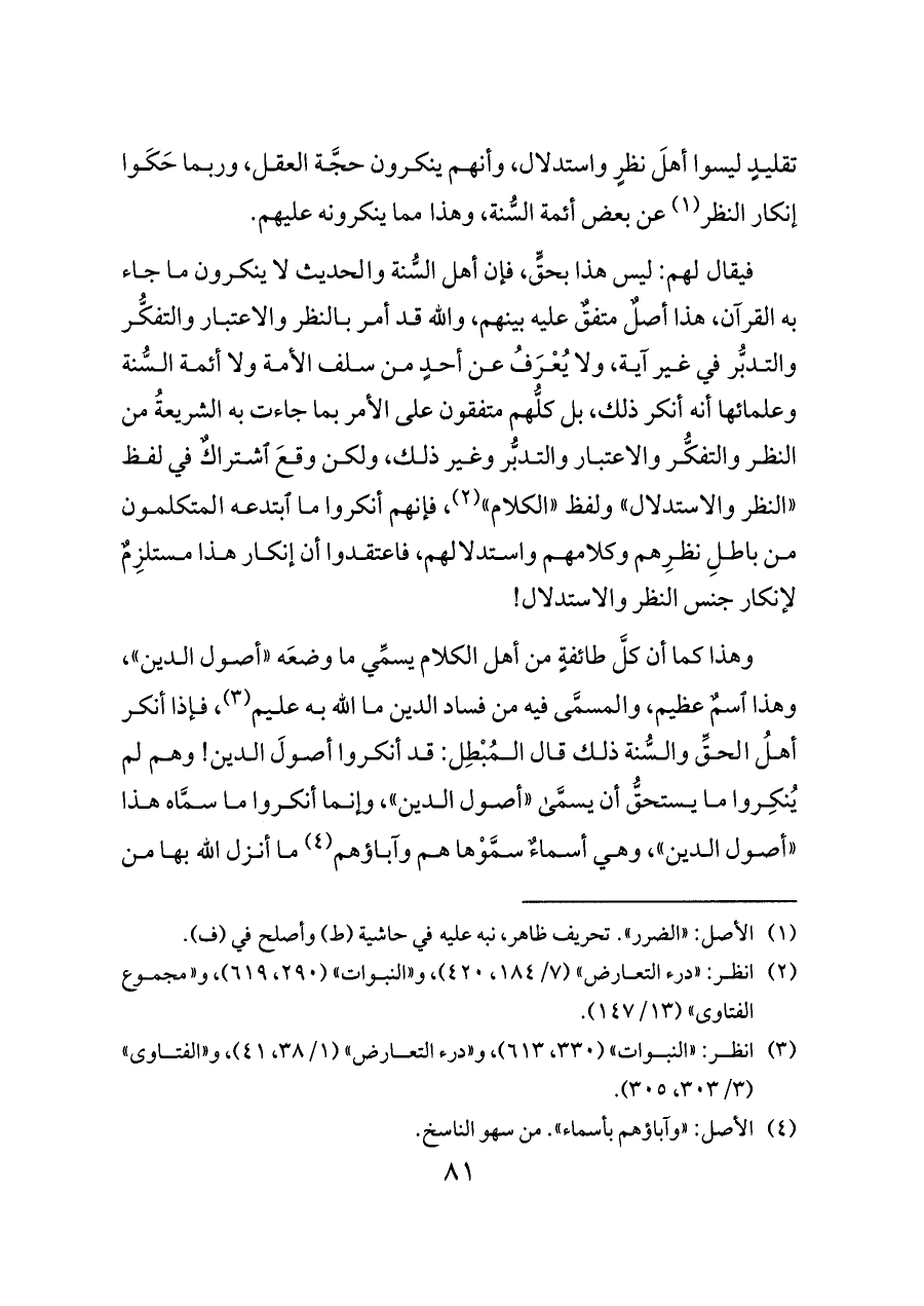 وهذا كما أن كلَّ طائفةٍ من أهل الكلام يسمِّي ما وضعَه «أصول الدين»، وهذا اسمٌ عظيم، والمسمَّى فيه من فساد الدين ما الله به عليم (¬٣)، فإذا أنكر أهلُ الحقِّ والسُّنة ذلك قال المُبْطِل: قد أنكروا أصولَ الدين! وهم لم يُنكِروا ما يستحقُّ أن يسمَّى «أصول الدين»، وإنما أنكروا ما سمَّاه هذا «أصول الدين»، وهي أسماءٌ سمَّوْها هم وآباؤهم (¬٤) ما أنزل الله بها من