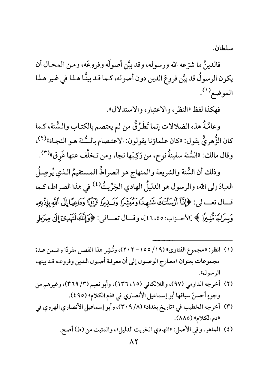 وعامَّةُ هذه الضلالات إنما تَطْرُقُ من لم يعتصم بالكتاب والسُّنة، كما كان الزُّهريُّ يقول: «كان علماؤنا يقولون: الاعتصام بالسُّنة هو النجاة» (¬٢)، وقال مالك: «السُّنة سفينةُ نوح، من رَكِبَها نجا، ومن تخلَّف عنها غَرِق» (¬٣).
