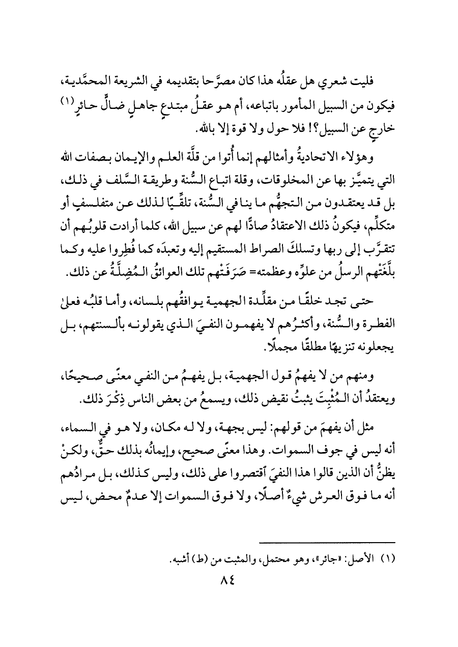 حتى تجد خلقًا من مقلِّدة الجهمية يوافقُهم بلسانه، وأما قلبُه فعلى الفطرة والسُّنة، وأكثرُهم لا يفهمون النفيَ الذي يقولونه بألسنتهم، بل يجعلونه تنزيهًا مطلقًا مجملًا.
