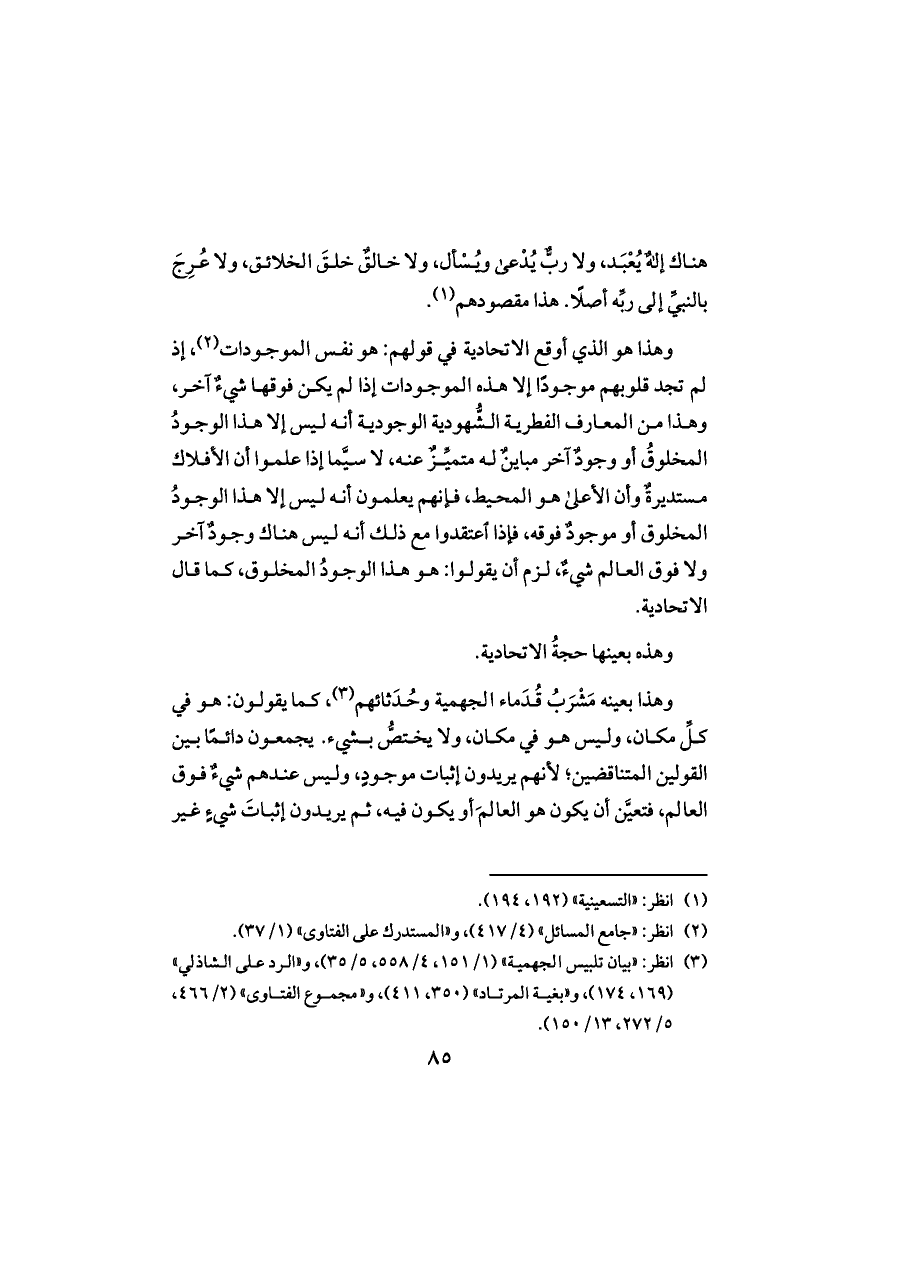 هناك إلهٌ يُعْبَد، ولا ربٌّ يُدْعى ويُسْأل، ولا خالقٌ خلقَ الخلائق, ولا عُرِجَ بالنبيِّ إلى ربِّه أصلًا. هذا مقصودهم (¬١).