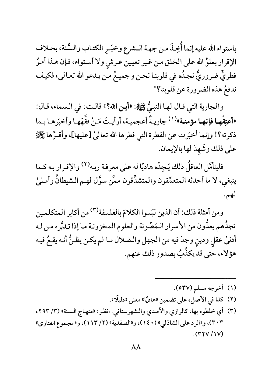 والجارية التي قال لها النبيُّ - صلى الله عليه وسلم -: «أين الله؟» قالت: في السماء، قال: «أعتِقْها فإنها مؤمنة» (¬١) جاريةٌ أعجمية، أرأيتَ مَنْ فقَّهَها وأخبَرها بما ذكرته؟! وإنما أخبَرت عن الفطرة التي فطرها الله تعالى [عليها]، وأقرَّها - صلى الله عليه وسلم - على ذلك وشَهِدَ لها بالإيمان.