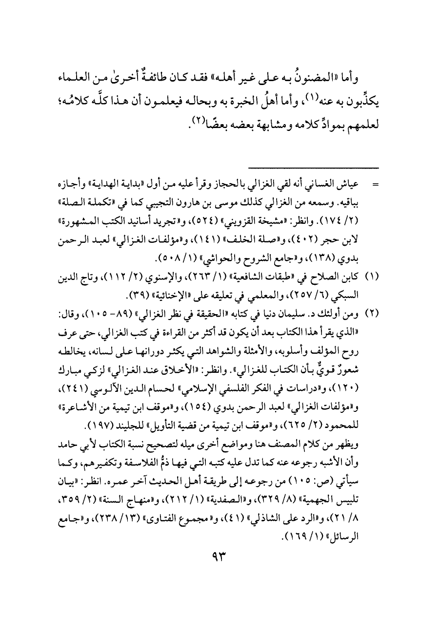 (¬٢) ومن أولئك د. سليمان دنيا في كتابه «الحقيقة في نظر الغزالي» (٨٩ - ١٠٥) , وقال: «الذي يقرأ هذا الكتاب بعد أن يكون قد أكثر من القراءة في كتب الغزالي, حتى عرف روح المؤلف وأسلوبه, والأمثلة والشواهد التي يكثر دورانها على لسانه, يخالطه شعورٌ قويٌّ بأن الكتاب للغزالي». وانظر: «الأخلاق عند الغزالي» لزكي مبارك (١٢٠) , و «دراسات في الفكر الفلسفي الإسلامي» لحسام الدين الآلوسي (٢٤١) , و «مؤلفات الغزالي» لعبد الرحمن بدوي (١٥٤) , و «موقف ابن تيمية من الأشاعرة» للمحمود (٢/ ٦٢٥) , و «موقف ابن تيمية من قضية التأويل» للجليند (١٩٧).