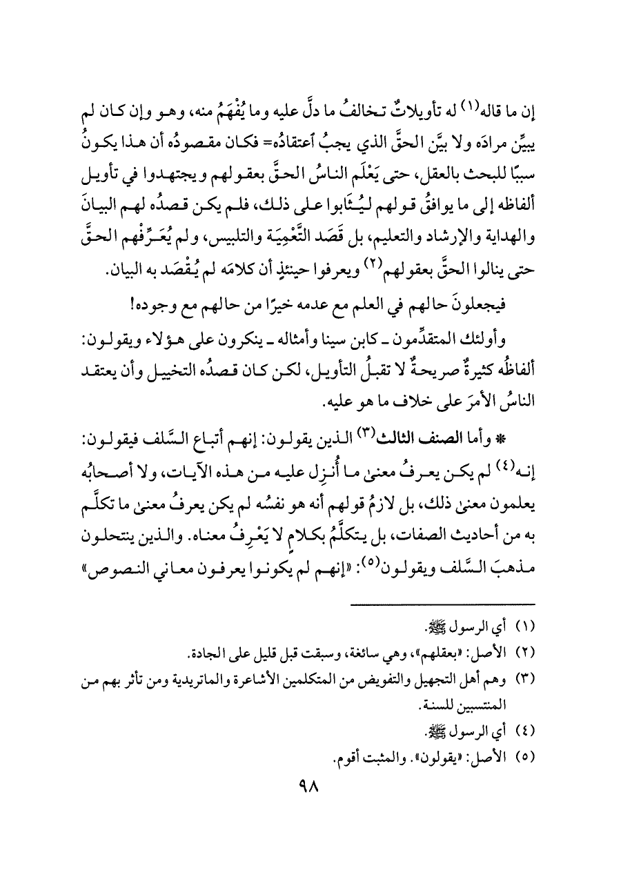 * وأما الصنف الثالث (¬٣) الذين يقولون: إنهم أتباع السَّلف فيقولون: إنه (¬٤) لم يكن يعرفُ معنى ما أُنزِل عليه من هذه الآيات، ولا أصحابُه يعلمون معنى ذلك، بل لازمُ قولهم أنه هو نفسُه لم يكن يعرفُ معنى ما تكلَّم به من أحاديث الصفات، بل يتكلَّمُ بكلامٍ لا يَعْرِفُ معناه. والذين ينتحلون مذهبَ السَّلف ويقولون (¬٥): «إنهم لم يكونوا يعرفون معاني النصوص»