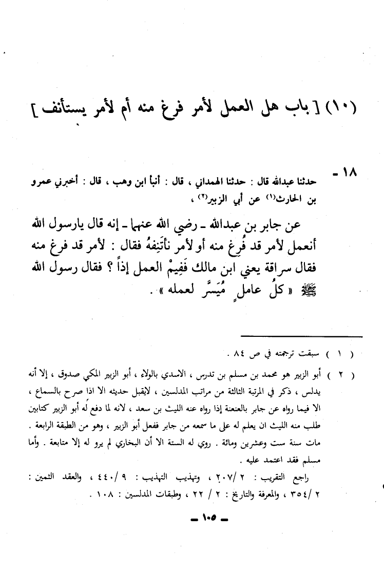 ١٨ - حَدَّثَنَا عَبْدُ اللَّهِ قَالَ: حَدَّثَنَا الْهَمْدَانِيُّ قَالَ: أَخْبَرَنِي عَمْرُو بْنُ الْحَارِثِ، عَنْ أَبِي الزُّبَيْرِ، عَنْ جَابِرِ بْنِ عَبْدِ اللَّهِ رَضِيَ اللَّهُ عَنْهُمَا أَنَّهُ قَالَ: يَا رَسُولَ اللَّهِ، أَنَعْمَلُ لِأَمْرٍ قَدْ فُرِغَ مِنْهُ، أَوْ لِأَمْرٍ نَأْتَنِفُهُ؟ فَقَالَ: «لِأَمْرٍ قَدْ فُرِغَ مِنْهُ» فَقَالَ سُرَاقَةُ - يَعْنِي ابْنَ مَالِكٍ -: فَفِيمَ الْعَمَلُ إِذًا؟ فَقَالَ رَسُولُ اللَّهِ صَلَّى اللهُ عَلَيْهِ وَسَلَّمَ: «كُلُّ عَامِلٍ مُيَسَّرٌ لِعَمَلِهِ»