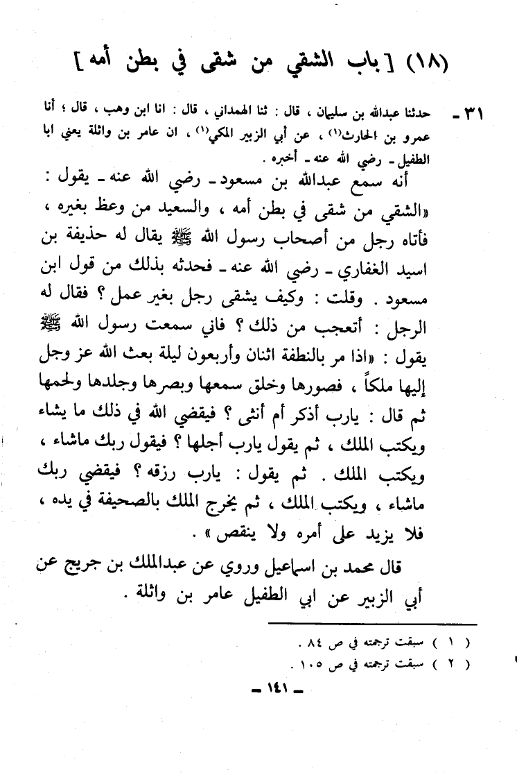 ٣١ - أنا عَمْرُو بْنُ الْحَارِثِ، عَنْ أَبِي الزُّبَيْرِ الْمَكِّيِّ، أَنَّ عَامِرَ بْنَ وَاثِلَةَ يَعْنِي أَبَا الطُّفَيْلِ رَضِيَ اللَّهُ عَنْهُ أَخْبَرَهُ، أَنَّهُ سَمِعَ عَبْدَ اللَّهِ بْنَ مَسْعُودٍ رَضِيَ اللَّهُ عَنْهُ يَقُولُ: الشَّقِيُّ مَنْ شَقِيَ فِي بَطْنِ أُمِّهِ، وَالسَّعِيدُ مَنْ وُعِظَ بِغَيْرِهِ، فَأَتَاهُ رَجُلٌ مِنْ أَصْحَابِ رَسُولِ اللَّهِ صَلَّى اللهُ عَلَيْهِ وَسَلَّمَ يُقَالُ لَهُ حُذَيْفَةُ بْنُ أَسِيدٍ الْغِفَارِيُّ رَضِيَ اللَّهُ عَنْهُ فَحَدَّثَهُ بِذَلِكَ مِنْ قَوْلِ ابْنِ مَسْعُودٍ، وَقُلْتُ: وَكَيْفَ يَشْقَى رَجُلٌ بِغَيْرِ عَمَلٍ؟ فَقَالَ لَهُ الرَّجُلُ: أَتَعْجَبُ مِنْ ذَلِكَ، فَإِنِّي سَمِعْتُ رَسُولَ اللَّهِ صَلَّى اللهُ عَلَيْهِ وَسَلَّمَ يَقُولُ: إِذَا مَرَّ بِالنُّطْفَةِ اثْنَانِ وَأَرْبَعُونَ لَيْلَةً بَعَثَ اللَّهُ عَزَّ وَجَلَّ إِلَيْهَا مَلَكًا فَصَوَّرَهَا، وَخَلَقَ سَمْعَهَا وَبَصَرَهَا وَجِلْدَهَا وَلَحْمَهَا، ثُمَّ قَالَ: يَا رَبِّ، أَذَكَرٌ أَمْ أُنْثَى؟ فَيَقْضِي اللَّهُ فِي ذَلِكَ مَا يَشَاءُ، وَيَكْتُبُ المَلَكُ، ثُمَّ يَقُولُ: يَا رَبِّ، أَجَلُهَا؟ فَيَقُولُ رَبُّكَ مَا شَاءَ، وَيَكْتُبُ المَلَكُ ثُمَّ يَقُولُ: يَا رَبِّ، رِزْقُهُ؟ فَيَقْضِي رَبُّكَ مَا شَاءَ وَيَكْتُبُ المَلَكُ، ثُمَّ يَخْرُجُ المَلَكُ بِالصَّحِيفَةِ فِي يَدِهِ، فَلَا يَزِيدُ عَلَى أَمْرِهِ وَلَا يَنْقُصُ قَالَ مُحَمَّدُ بْنُ إِسْمَاعِيلَ: وَرُوِيَ عَنْ عَبْدِ المَلَكِ بْنِ جُرَيْجٍ، عَنْ أَبِي الزُّبَيْرِ، عَنْ أَبِي الطُّفَيْلِ عَامِرِ بْنِ وَاثِلَةَ