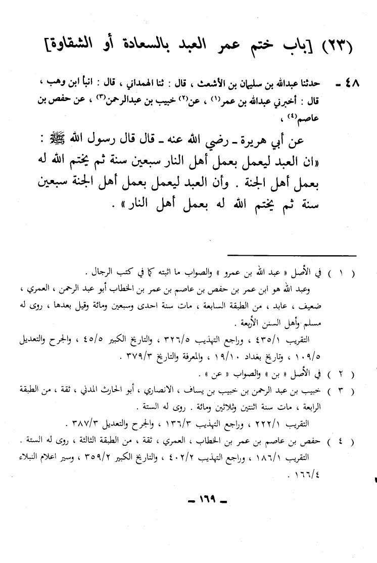 ٤٨ - أَخْبَرَنِي عَبْدُ اللَّهِ بْنُ عُمَرَ، عَنْ خُبَيْبِ بْنِ عَبْدِ الرَّحْمَنِ، عَنْ حَفْصِ بْنِ عَاصِمٍ، عَنْ أَبِي هُرَيْرَةَ رَضِيَ اللَّهُ عَنْهُ قَالَ: قَالَ رَسُولُ اللَّهِ صَلَّى اللهُ عَلَيْهِ وَسَلَّمَ: " إِنَّ الْعَبْدَ لَيَعْمَلُ بِعَمَلِ أَهْلِ النَّارِ سَبْعِينَ سَنَةً، ثُمَّ يَخْتِمُ اللَّهُ لَهُ بِعَمَلِ أَهْلِ الْجَنَّةِ، وَإِنَّ الْعَبْدَ لَيَعْمَلُ بِعَمَلِ أَهْلِ الْجَنَّةِ سَبْعِينَ سَنَةً ثُمَّ يَخْتِمُ اللَّهُ لَهُ بِعَمَلِ أَهْلِ النَّارِ