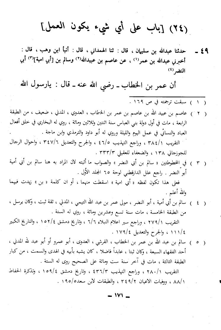 ٤٩ - أَخْبَرَنِي عَبْدُ اللَّهِ بْنُ عُمَرَ، عَنْ عَاصِمِ بْنِ عُبَيْدِ اللَّهِ، وَسَالِمِ بْنِ أَبِي أُمَيَّةَ أَبِي النَّضْرِ، أَنَّ عُمَرَ بْنَ الْخَطَّابِ رَضِيَ اللَّهُ عَنْهُ قَالَ: يَا رَسُولَ اللَّهِ، ⦗١٧٢⦘ أَنَعْمَلُ لِمَا قَدْ جَرَتْ بِهِ الْأَقْلَامُ وَجَفَّتْ بِهِ الْمَقَادِيرُ، أَمْ لِأَمْرِ نَأْتَنِفُهُ ائْتِنَافًا؟ قَالَ: «بَلْ لِمَا جَرَتْ بِهِ الْأَقْلَامُ وَجَفَّتْ بِهِ الْمَقَادِيرُ» قَالَ: فَفِيمَ الْعَمَلُ؟ قَالَ: «كُلٌّ مُيَسَّرٌ لِمَا خُلِقَ لَهُ» قَالَ: الْآنَ الِاجْتِهَادُ