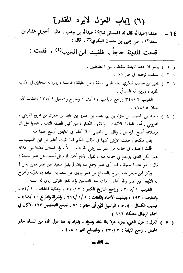 ١٤ - أَخْبَرَنِي هِشَامُ بْنُ سَعْدٍ، عَنْ يَحْيَى بْنِ حَسَّانَ الْبَكْرِيِّ، قَالَ: قَدِمْتُ الْمَدِينَةَ حَاجًّا، فَلَقِيتُ ابْنَ الْمُسَيَّبِ فَقُلْتُ: ⦗٩٠⦘ يَا أَبَا مُحَمَّدٍ، كَيْفَ تَقُولُ فِي الْعَزْلِ؟ فَقَالَ: إِنْ شِئْتَ حَدَّثْتُكَ حَدِيثًا مُوجَزًا، إِنَّ اللَّهَ عَزَّ وَجَلَّ لَمَّا خَلَقَ آدَمَ أَرَاهُ كَرَامَةً لَمْ يُرِهَا أَحَدًا مِنْ خَلْقِهِ، أَرَاهُ كُلَّ نَسَمَةٍ هُوَ خَالِقُهَا بَيْنَ يَدَيْهِ إِلَى يَوْمِ الْقِيَامَةِ، فَمَنْ حَدَّثَكَ أَنَّهُ يَزِيدُ فِيهِمْ أَوْ يَنْقُصُ فَقَدْ كَذَبَ، وَلَوْ كَانَ لِي سَبْعُونَ مَا بَالَيْتُ