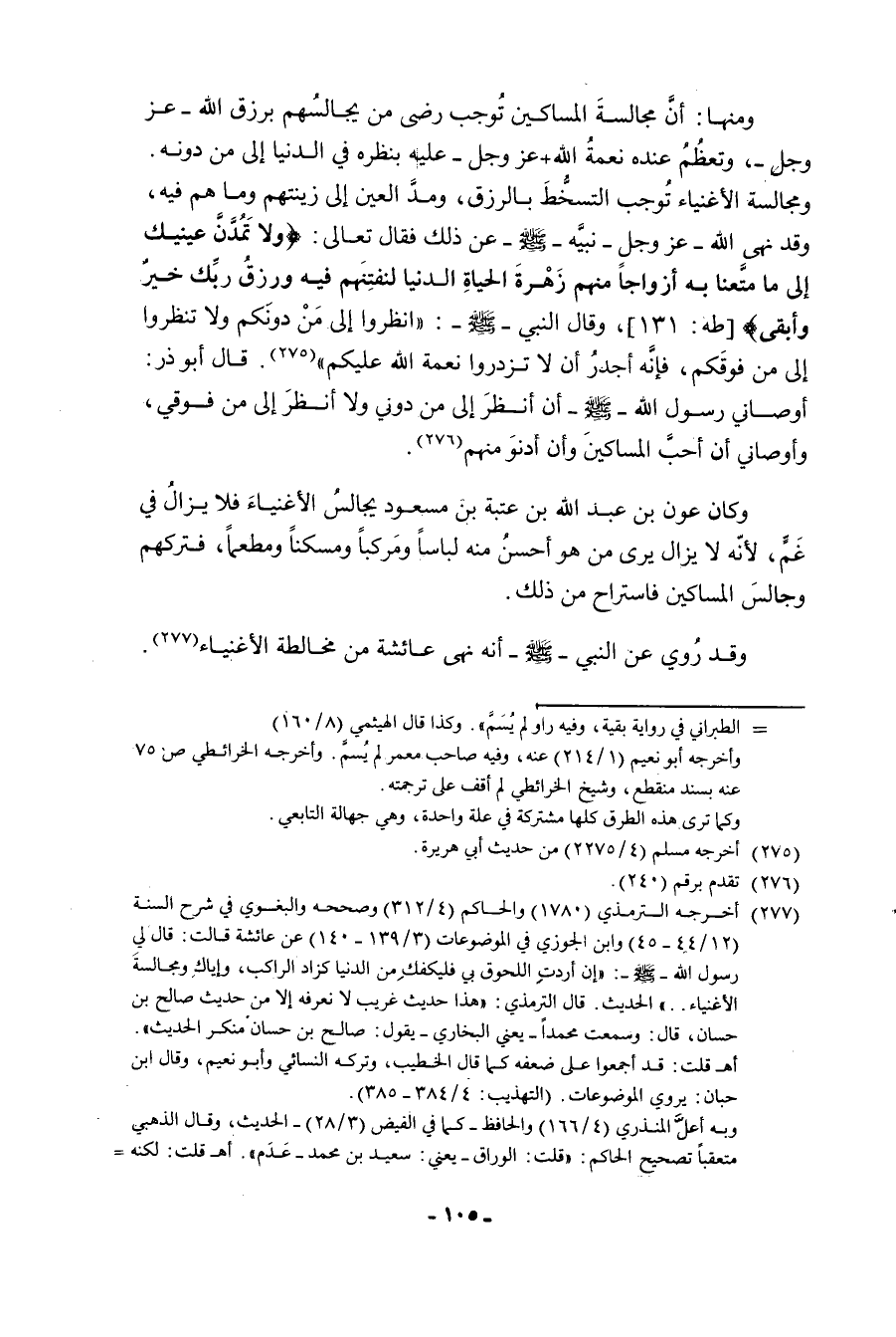 ومنها: أن مجالسة المساكين توجب رضى من يجالسهم برزق الله عز وجل، وتعظم عنده نعمة الله عز وجل عليه بنظره في الدنيا إلى من دونه. ومجالسة الأغنياء توجي السخط بالرزق، ومد العين إلى زينتهم وما هم فيه، وقد نهى الله عز وجل نبيه (عن ذلك فقال تعالى: (ولا تَمُدَّنَّ عينيك إلى ما متَّعنا به أزواجاً منهم زَهْرَةَ الحياةِ الدنيا لنفتِنَهم فيه ورزقُ ربِّك خيرٌ وأبقى) طه: 131، وقال النبي (: " انظروا إلى من دونكم ولا تنظروا إلى من فوقكم، فإنه أجدر أن لا تزدروا نعمة الله عليكم ". قال أبو ذر: أوصاني رسول الله (أن أنظر إلى من دوني ولا أنظر إلى من فوقي، وأوصاني أن أحب المساكين وأن أدنو منهم.