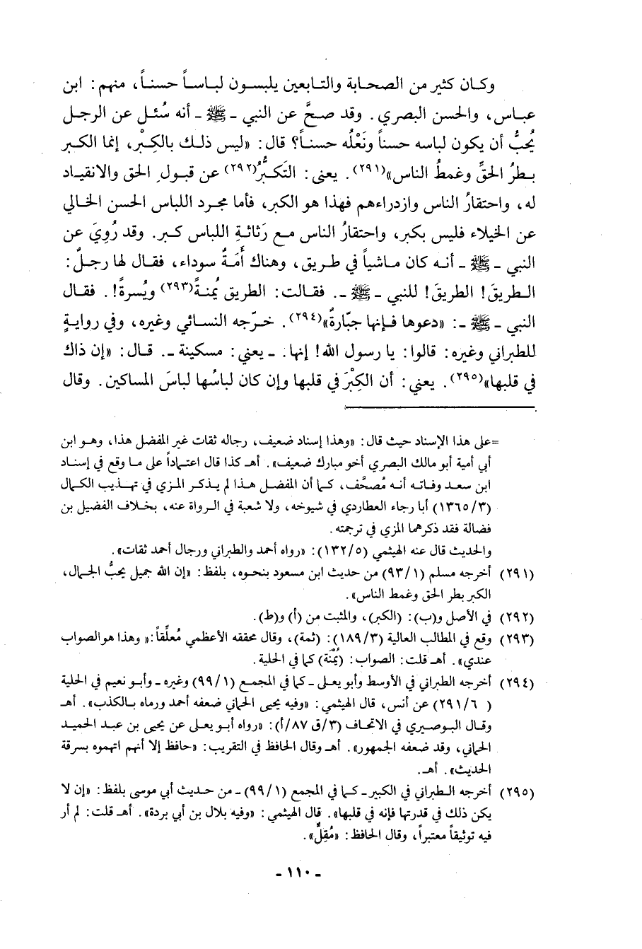 وكان كثير من الصحابة والتابعين يلبسون لباساً حسناً، منهم: ابن عباس، والحسن البصري. وقد صح عن النبي (أنه سئل عن الرجل يحب أن يكون لباسه حسناً ونعله حسناً؟ قال: " ليس ذلك بالكبر، إنما الكبر بطر الحق وغمط الناس ". يعني: التكبر عن قبول الحق والانقياد له، واحتقار الناس وازدراءهم فهذا هو الكبر، فأما مجرد اللباس الحسن الخالي عن الخيلاء فليس بكبر، واحتقار الناس مع رثاثة اللباس كبر. وقد روي عن النبي (أنه كان ماشياً في طريق، وهناك أمة سوداء، فقال لها رجل: الطريق! الطريق! للنبي (. فقالت: الطريق يمنة ويسرة!. فقال النبي (: " دعوها فإنها جبارة ". خرجه النسائي وغيره، وفي رواية للطبراني وغيره: قالوا: يا رسول الله! إنها. يعني: مسكينة. قال: " إن ذاك في قلبها ". يعني أن الكبر في قلبها وإن كان لباسها لباس المساكين. وقال