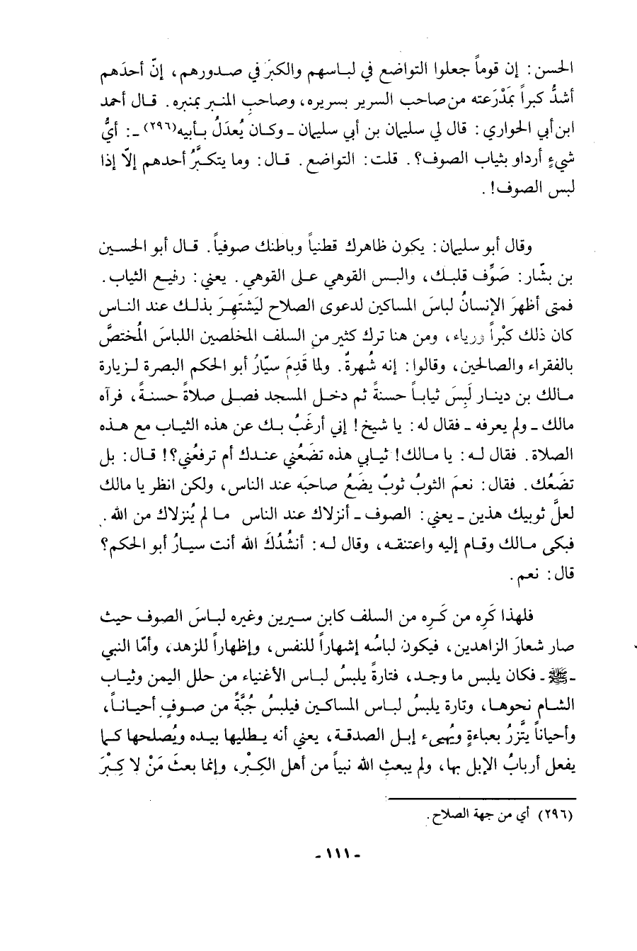 وقال أبو سليمان: يكون ظاهرك قطنياً وباطنك صوفياً. قال أبو الحسين بن بشار: صوف قلبك، والبس القوهي على القوهي. يعني: رفيع الثياب. فمتى أظهر الإنسان لباس المساكين لدعوى الصلاح ليشتهر بذلك عند الناس كان ذلك كبراً ورياء، ومن هنا ترك كثير من السلف المخلصين اللباس المختص بالفقراء والصالحين، وقالوا: إنه شهرة. ولما قدم سيار أبو الحكم البصرة لزيارة مالك بن دينار لبس ثياباً حسنة ثم دخل المسجد فصلى صلاة حسنة، فرآه مالك ولم يعرفه فقال له: يا شيخ! إني أرغب بك عن هذه الثياب مع هذه الصلاة. فقال له: يا مالك! ثيابي هذه تضعني عندك أم ترفعني؟! قال: بل تضعك. فقال: نعم الثوب ثوب يضع صاحبه عند الناس، ولكن انظر يا مالك لعل ثوبيك هذين يعني: الصوف أنزلاك عند الناس ما لم ينزلاك من الله. فبكى مالك وقام إليه واعتنقه، وقال له: أنشدك الله أنت سيار أبو الحكم؟ قال: نعم.
