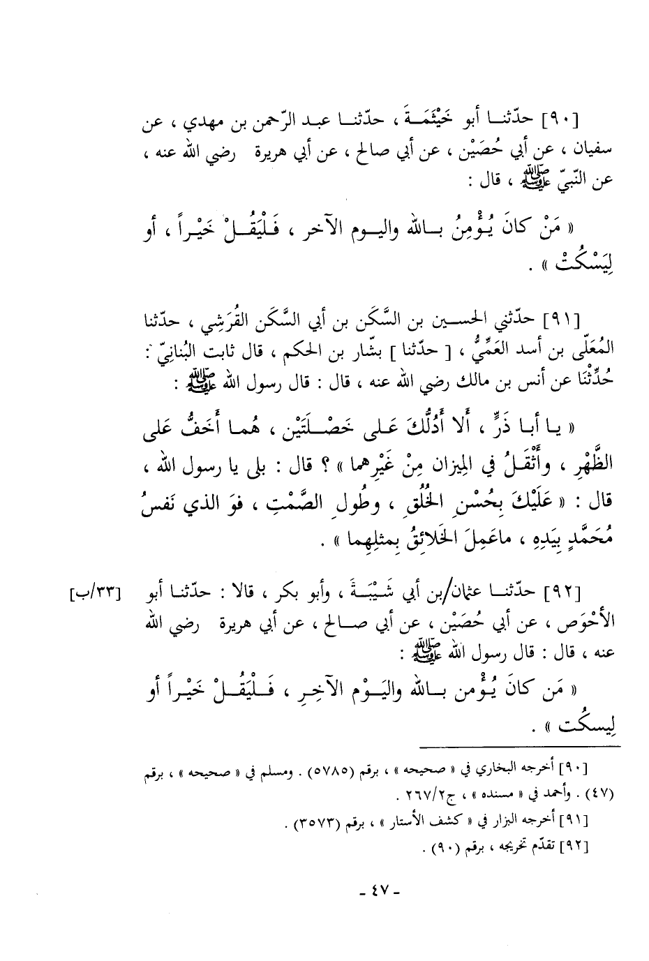 90 - حدثنا أبو خيثمة، حدثنا عبد الرحمن بن مَهْدِيٍّ، عَنْ سُفْيَانَ، عَنْ أَبِي حُصَيْنٍ، عَنْ أَبِي صَالِحٍ، عَنْ أَبِي هُرَيْرَةَ رَضِيَ اللَّهُ عَنْهُ،: عَنِ النَّبِيِّ صَلَّى اللهُ عَلَيْهِ وَسَلَّمَ، قَالَ: (مَنْ كَانَ يُؤْمِنُ بِاللَّهِ وَالْيَوْمِ الْآخِرِ، فَلْيَقُلْ خَيْرًا، أَوْ لِيَسْكُتْ) .