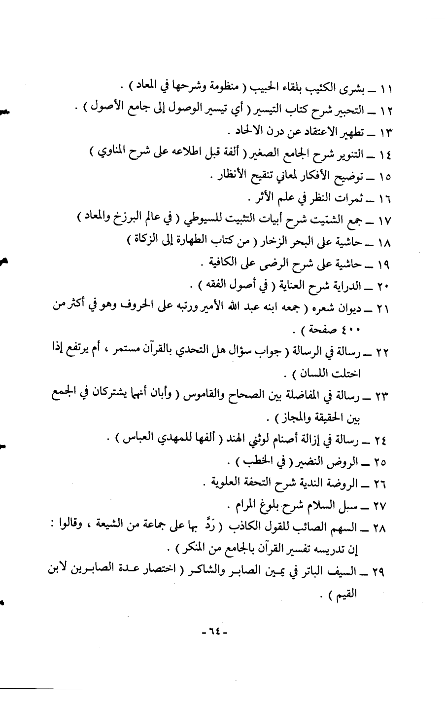 11 - بشرى الكئيب بلقاء الحبيب منظومة وَشَرحهَا فِي المعاذ 12 التحبير شرح كتاب التَّيْسِير أَي تيسير الْوُصُول إِلَى جَامع الْأُصُول 13 تَطْهِير الِاعْتِقَاد عَن درن الْإِلْحَاد 14 التَّنْوِير شرح الْجَامِع الصَّغِير ألفة قبل اطِّلَاعه على شرح الْمَنَاوِيّ 15 توضيح الأفكار لمعاني تَنْقِيح الأنظار 16 ثَمَرَات النّظر فِي علم الْأَثر 17 جمع الشتيت شرح أَبْيَات التثبيت للسيوطي فِي عَالم البرزخ والمعاد 18 حَاشِيَة على الْبَحْر والزخار من كتاب الطَّهَارَة إِلَى الزَّكَاة 19 حَاشِيَة على شرح الرضى على الكافية 20 الدِّرَايَة شرح الْعِنَايَة فِي أصُول الْفِقْه 21 ديوَان شعره جمعه ابْنه عبد الله الْأَمِير ورتبه على الْحُرُوف وَهُوَ فِي أَكثر من 400 صفحة 22 رِسَالَة فِي الرسَالَة جَوَاب سُؤال هَل التحدي بِالْقُرْآنِ مُسْتَمر أم يرْتَفع إِذا اختلت اللِّسَان 23 رِسَالَة فِي المفاضلة بَين الصِّحَاح والقاموس وَأَبَان أَنَّهُمَا يَشْتَرِكَانِ فِي الْجمع بَين الْحَقِيقَة وَالْمجَاز 24 رِسَالَة فِي إِزَالَة أصنام لوثني الْهِنْد ألفها للمهدي الْعَبَّاس 25 الرَّوْض النَّضِير فِي الْخطب 26 الرَّوْضَة الندية شرح التُّحْفَة العلوية 27 سبل السَّلَام شرح بُلُوغ المرام 28 السهْم الصائب لِلْقَوْلِ الْكَاذِب رد بهَا على جمَاعَة من الشِّيعَة وَقَالُوا إِن تدريسه تَفْسِير الْقُرْآن بالجامع من الْمُنكر 29 السَّيْف الباتر فِي يَمِين الصابر والشاكر اخْتِصَار عدَّة الصابرين لِابْنِ الْقيم