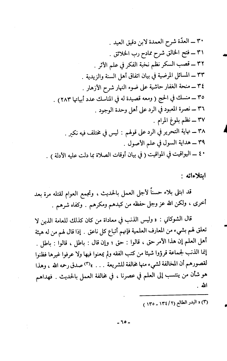 30 - الْعدة شرح العمدى لِابْنِ دَقِيق الْعِيد 31 فتح الْخَالِق شرح ممادح رب الْخَلَائق 32 قصب السكر نظم نخبة الْفِكر فِي علم الْأَثر 33 الْمسَائِل المرضية فِي بَيَان اتِّفَاق أهل السّنة والزيدية 34 منحة الْغفار حَاشِيَة على ضوء النَّهَار شرح الأزهار 35 منسك فِي الْحَج وَمَعَهُ قصيدة لَهُ فِي الْمَنَاسِك عدد أبياتها 283 36 نصْرَة المعبود فِي الرَّد على أهل وحدة الْوُجُود 37 نظم بُلُوغ المرام 38 نِهَايَة التَّحْرِير فِي الرَّد على قَوْلهم لَيْسَ فِي مُخْتَلف فِيهِ نَكِير 39 هِدَايَة السول فِي علم الْأُصُول 40 اليواقيت فِي الْمَوَاقِيت فِي بَيَان أَوْقَات الصَّلَاة بِمَا دلّت عَلَيْهِ الْأَدِلَّة