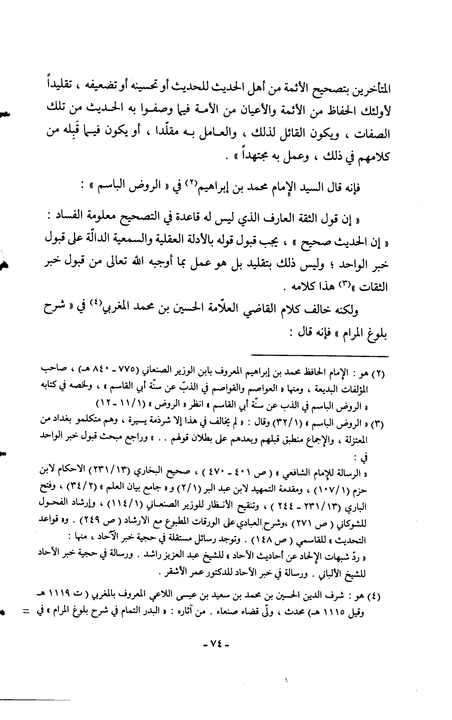 الْمُتَأَخِّرين بتصحيح الْأَئِمَّة من أهل الحَدِيث للْحَدِيث أَو تُحسنهُ أَو تَضْعِيفه تقليدا لأولئك الْحفاظ من الْأَئِمَّة والأعيان من الْأمة فِيمَا وصفوا بِهِ الحَدِيث من تِلْكَ الصِّفَات وَيكون الْقَائِل لذَلِك وَالْعَامِل بِهِ مُقَلدًا أَو يكون فِيمَا قبله من كَلَامهم فِي ذَلِك وَعمل بِهِ مُجْتَهدا فَإِنَّهُ قَالَ السَّيِّد الإِمَام مُحَمَّد بن إِبْرَاهِيم فِي الرَّوْض الباسم إِن قَول الثِّقَة الْعَارِف الَّذِي لَيْسَ لَهُ قَاعِدَة فِي التَّصْحِيح مَعْلُومَة الْفساد إِن الحَدِيث صَحِيح يجب قبُول قَوْله بالأدلة الْعَقْلِيَّة والسمعية الدَّالَّة على قبُول خبر الْوَاحِد وَلَيْسَ ذَلِك بتقليد بل هُوَ عمل بِمَا أوجبه الله تَعَالَى من قبُول خبر الثِّقَات هَذَا كَلَامه وَلكنه خَالف كَلَام القَاضِي الْعَلامَة الْحُسَيْن بن مُحَمَّد المغربي فِي شرح بُلُوغ المرام فَإِنَّهُ قَالَ