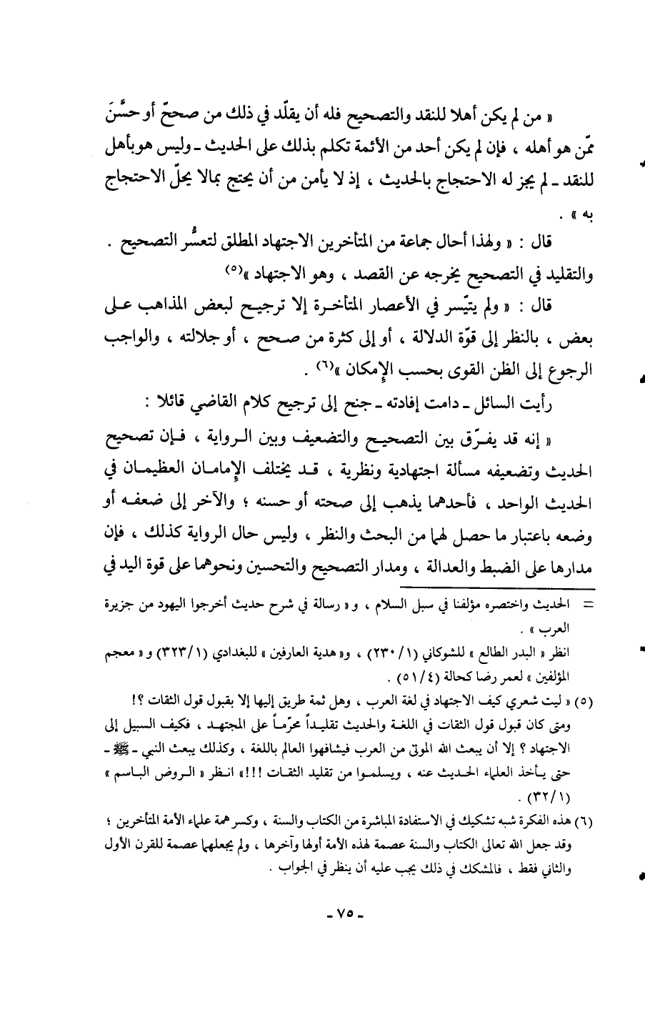 من لم يكن أَهلا للنقد والتصحيح فَلهُ أَن يُقَلّد فِي ذَلِك من صحّح أَو حسن مِمَّن هُوَ أَهله فَإِن لم يكن أحد من الْأَئِمَّة تكلم بذلك على الحَدِيث وَلَيْسَ هُوَ بِأَهْل للنقد لم يجز لَهُ الِاحْتِجَاج بِالْحَدِيثِ إِذْ لَا يَأْمَن من أَن يحْتَج بِمَا لَا يحل الِاحْتِجَاج بِهِ قَالَ وَلِهَذَا أحَال جمَاعَة من الْمُتَأَخِّرين الِاجْتِهَاد الْمُطلق لتعسر التَّصْحِيح والتقليد فِي التَّصْحِيح يُخرجهُ عَن الْقَصْد وَهُوَ الإجتهاد قَالَ وَلم يَتَيَسَّر فِي الْأَعْصَار الْمُتَأَخِّرَة إِلَّا تَرْجِيح لبَعض الْمذَاهب على بعض بِالنّظرِ إِلَى قُوَّة الدّلَالَة أَو إِلَى كَثْرَة من صحّح أَو جلالته وَالْوَاجِب الرُّجُوع إِلَى الظَّن القوى بِحَسب الْإِمْكَان رَأَيْت السَّائِل دَامَت إفادته جنح إِلَى تَرْجِيح كَلَام القَاضِي قَائِلا إِنَّه قد يفرق بَين التَّصْحِيح والتضعيف وَبَين الرِّوَايَة فَإِن تَصْحِيح الحَدِيث وتضعيفه مَسْأَلَة اجتهادية ونظرية قد يخْتَلف الإمامان العظيمان فِي الحَدِيث الْوَاحِد فأحدهما يذهب إِلَى صِحَّته أَو حسنه وَالْآخر إِلَى ضعفه أَو وَضعه بِاعْتِبَار مَا حصل لَهما من الْبَحْث وَالنَّظَر وَلَيْسَ حَال الرِّوَايَة كَذَلِك فَإِن مدارها على الضَّبْط وَالْعَدَالَة ومدار التَّصْحِيح والتحسين وَنَحْوهمَا على قُوَّة الْيَد فِي