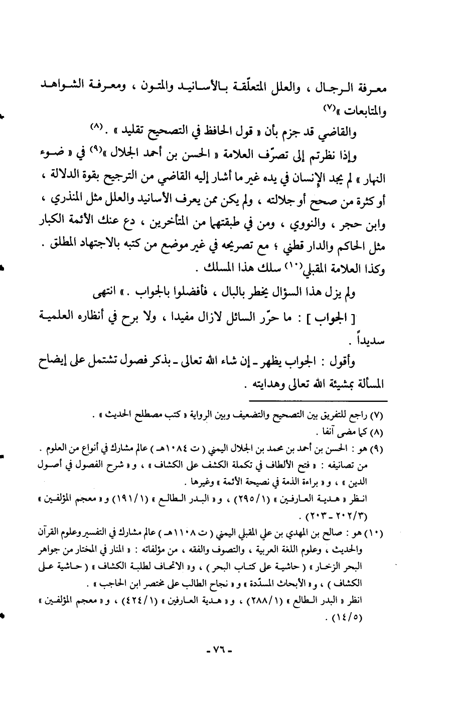 معرفَة الرِّجَال والعلل الْمُتَعَلّقَة بِالْأَسَانِيدِ والمتون وَمَعْرِفَة الشواهد والمتابعات وَالْقَاضِي قد جزم بِأَن قَول الْحَافِظ فِي التَّصْحِيح تَقْلِيد وَإِذا نظرتم إِلَى تصرف الْعَلامَة الْحسن بن أَحْمد الْجلَال فِي ضوء النَّهَار لم يجد الْإِنْسَان فِي يَده غير مَا أَشَارَ إِلَيْهِ القَاضِي من التَّرْجِيح بِقُوَّة الدّلَالَة أَو كَثْرَة من صحّح أَو جلالته وَلم يكن مِمَّن يعرف الْأَسَانِيد والعلل مثل الْمُنْذِرِيّ وَابْن حجر وَالنَّوَوِيّ وَمن فِي طبقتهما من الْمُتَأَخِّرين دع عَنْك الْأَئِمَّة الْكِبَار مثل الْحَاكِم وَالدَّارَقُطْنِيّ مَعَ تصريحه فِي غير مَوضِع من كتبه بِالِاجْتِهَادِ الْمُطلق وَكَذَا الْعَلامَة المقبلي سلك هَذَا المسلك وَلم يزل هَذَا السُّؤَال يخْطر بالبال فأفضلوا بِالْجَوَابِ انْتهى