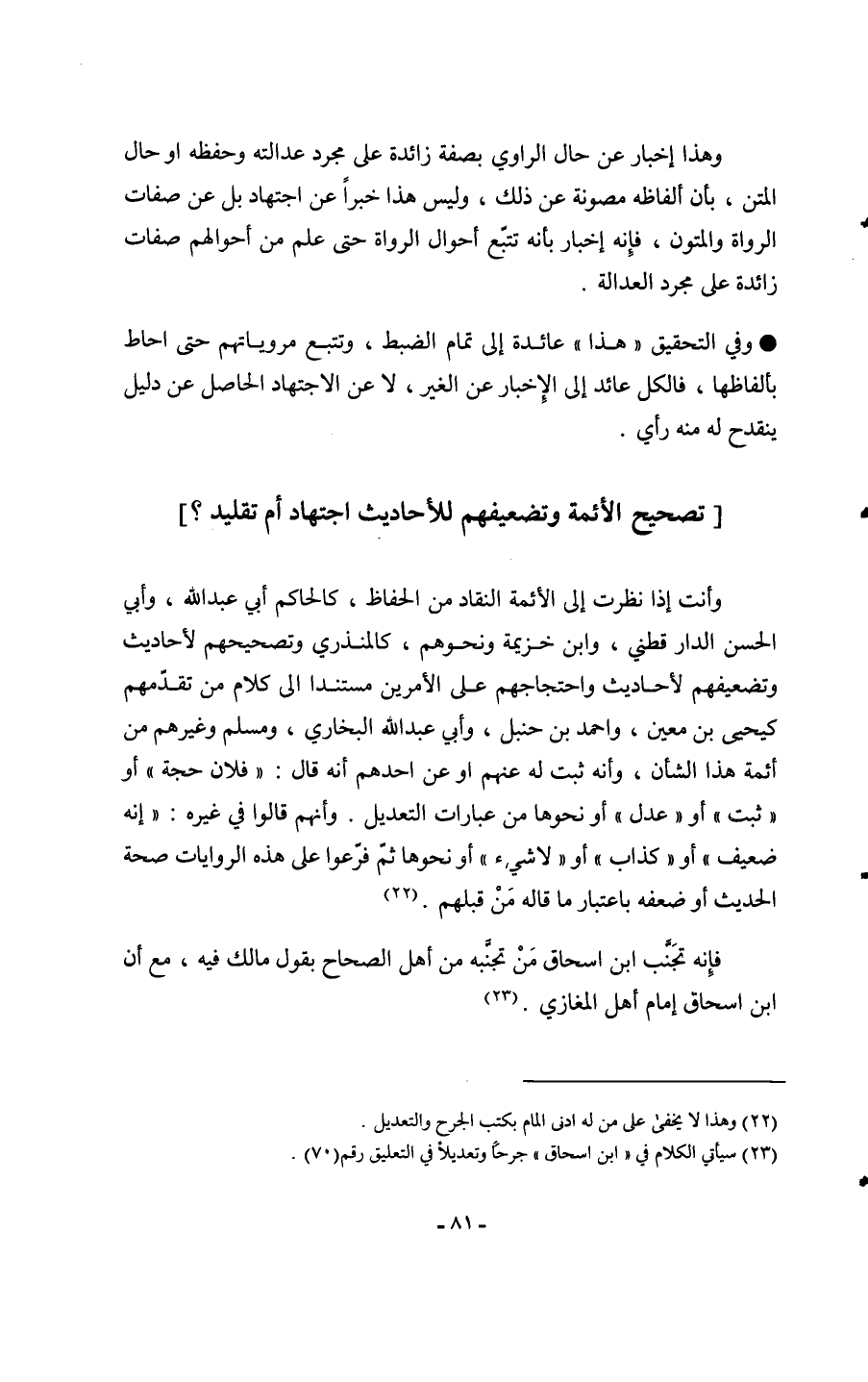 وَأَنت إِذا نظرت إِلَى الْأَئِمَّة النقاد من الْحفاظ كالحاكم أبي عبد الله وَأبي الْحسن الدَّارَقُطْنِيّ وَابْن خُزَيْمَة وَنَحْوهم كالمنذري وتصحيحهم لأحاديث وتضعيفهم لأحاديث واحتجاجهم على الْأَمريْنِ مُسْتَندا إِلَى كَلَام من تقدمهم كيحيى بن معِين وَأحمد بن حَنْبَل وَأبي عبد الله البُخَارِيّ وَمُسلم وَغَيرهم من أَئِمَّة هَذَا الشَّأْن وَأَنه ثَبت لَهُ عَنْهُم أَو عَن أحدهم أَنه قَالَ فلَان حجَّة أَو ثَبت أَو عدل أَو نَحْوهَا من عِبَارَات التَّعْدِيل وَأَنَّهُمْ قَالُوا فِي غَيره إِنَّه ضَعِيف أَو كَذَّاب أَو لَا شَيْء أَو نَحْوهَا ثمَّ فرعوا على هَذِه الرِّوَايَات صِحَة الحَدِيث أَو ضعفه بِاعْتِبَار مَا قَالَه من قبلهم فَإِنَّهُ تجنب ابْن إِسْحَاق من تجنبه من أهل الصِّحَاح بقول مَالك فِيهِ مَعَ أَن ابْن إِسْحَاق إِمَام أهل الْمَغَازِي