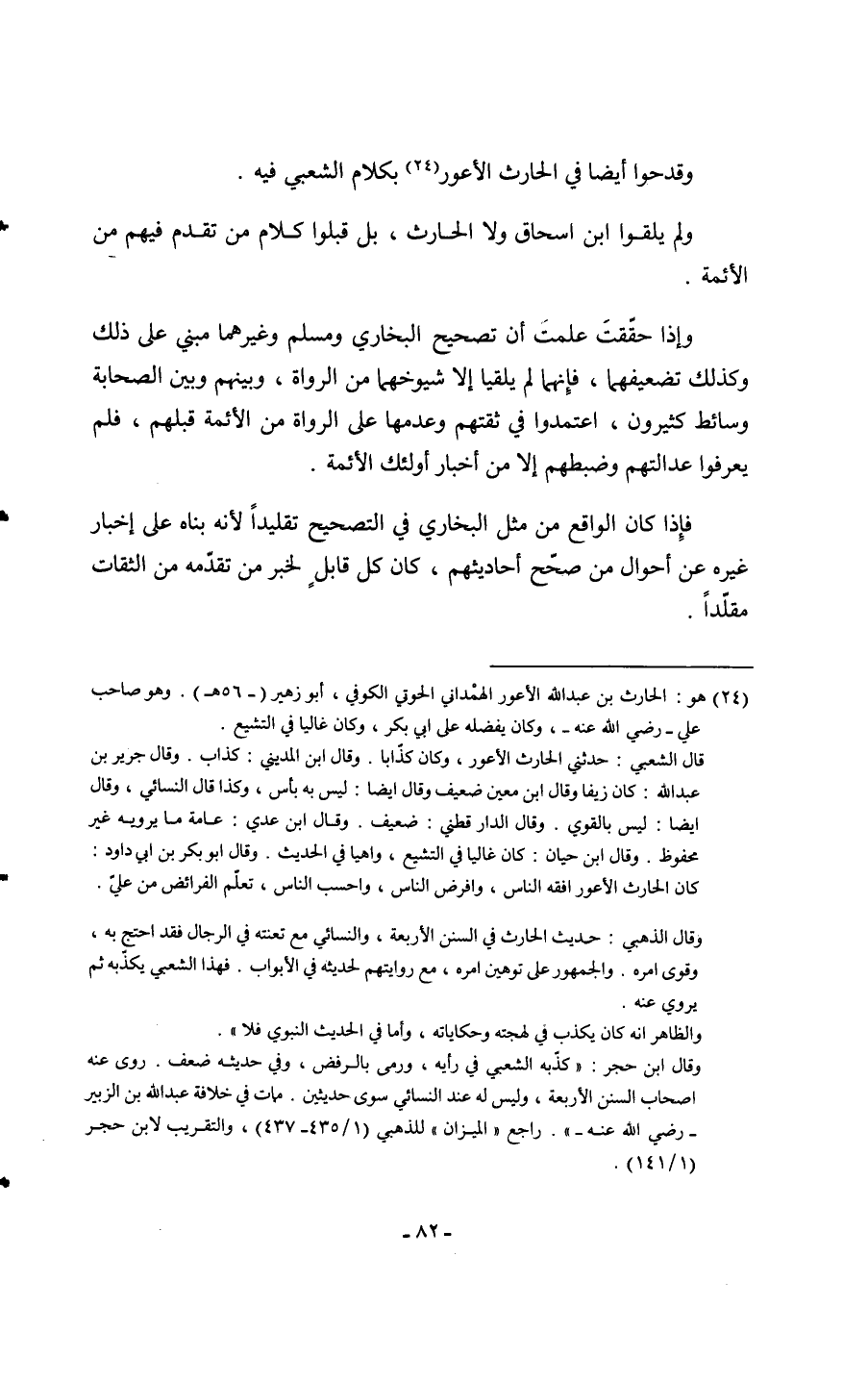 وقدحوا أَيْضا فِي الْحَارِث الْأَعْوَر بِكَلَام الشّعبِيّ فِيهِ وَلم يلْقوا ابْن إِسْحَاق وَلَا الْحَارِث بل قبلوا كَلَام من تقدم فيهم من الْأَئِمَّة وَإِذا حققت علمت أَن تَصْحِيح البُخَارِيّ وَمُسلم وَغَيرهمَا مَبْنِيّ على ذَلِك وَكَذَلِكَ تضعيفهما فَإِنَّهُمَا لم يلقيا إِلَّا شيوخهما من الروَاة وَبينهمْ وَبَين الصَّحَابَة وسائط كَثِيرُونَ اعتمدوا فِي ثقتهم وَعدمهَا على الروَاة من الْأَئِمَّة قبلهم فَلم يعرفوا عدالتهم وضبطهم إِلَّا من أَخْبَار أُولَئِكَ الْأَئِمَّة فَإِذا كَانَ الْوَاقِع من مثل البُخَارِيّ فِي التَّصْحِيح تقليدا لِأَنَّهُ بناه على إِخْبَار غَيره عَن أَحْوَال من صحّح أَحَادِيثهم كَانَ كل قَابل لخَبر من تقدمه من الثِّقَات مُقَلدًا