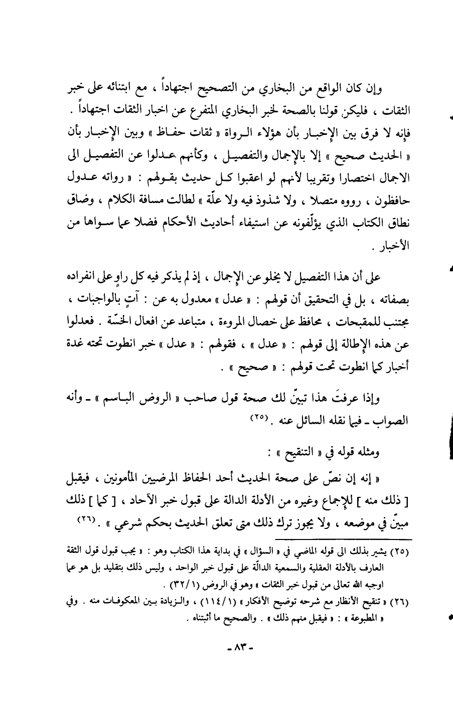 وَإِن كَانَ الْوَاقِع من البُخَارِيّ من التَّصْحِيح اجْتِهَادًا مَعَ ابتنائه على خبر الثِّقَات فَلْيَكُن قَوْلنَا بِالصِّحَّةِ لخَبر البُخَارِيّ المتفرع عَن إِخْبَار الثِّقَات اجْتِهَادًا فَإِنَّهُ لَا فرق بَين الْإِخْبَار بِأَن هَؤُلَاءِ الروَاة ثِقَات حفاظ وَبَين الْإِخْبَار بِأَن الحَدِيث صَحِيح إِلَّا بالإجمال وَالتَّفْصِيل وَكَأَنَّهُم عدلوا عَن التَّفْصِيل إِلَى الْإِجْمَال اختصارا وتقريبا لأَنهم لَو أعقبوا كل حَدِيث بقَوْلهمْ رُوَاته عدُول حافظون رَوَاهُ مُتَّصِلا وَلَا شذوذ فِيهِ وَلَا عِلّة لطالت مَسَافَة الْكَلَام وضاق نطاق الْكتاب الَّذِي يؤلفونه عَن اسْتِيفَاء أَحَادِيث الْأَحْكَام فضلا عَمَّا سواهَا من الْأَخْبَار على أَن هَذَا التَّفْصِيل لَا يَخْلُو عَن الْإِجْمَال إِذْ لم يذكر فِيهِ كل راو على انْفِرَاده بصفاته بل فِي التَّحْقِيق أَن قَوْلهم عدل معدول بِهِ عَن آتٍ بالواجبات مجتنب للمقبحات محافظ على خِصَال الْمُرُوءَة متباعد عَن أَفعَال الخسة فعدلوا عَن هَذِه الإطالة إِلَى قَوْلهم عدل فَقَوْلهم عدل خبر انطوت تَحْتَهُ غُدَّة أَخْبَار كَمَا انطوت تَحت قَوْلهم صَحِيح وَإِذا عرفت هَذَا تبين لَك صِحَة قَول صَاحب الرَّوْض الباسم وَأَنه الصَّوَاب فِيمَا نَقله السَّائِل عَنهُ وَمثله قَوْله فِي التَّنْقِيح إِنَّه إِن نَص على صِحَة الحَدِيث أحد الْحفاظ المرضيين المأمونين فَيقبل ذَلِك مِنْهُ للْإِجْمَاع وَغَيره من الْأَدِلَّة الدَّالَّة على قبُول خبر الْآحَاد كَمَا ذَلِك مُبين فِي مَوْضِعه وَلَا يجوز ترك ذَلِك مَتى تعلق الحَدِيث بِحكم شَرْعِي