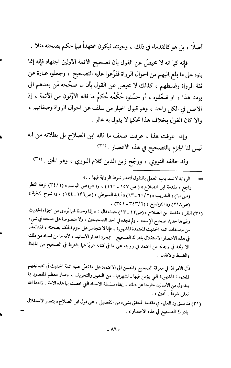 أصلا بل هُوَ كالقدماء فِي ذَلِك وَحِينَئِذٍ فَيكون مُجْتَهدا فِيمَا حكم بِصِحَّتِهِ مثلا فَإِنَّهُ كَمَا أَنه لَا محيص عَن القَوْل بِأَن تَصْحِيح الْأَئِمَّة الْأَوَّلين اجْتِهَاد فَإِنَّهُ إِنَّمَا بِنوح على مَا بلغ إِلَيْهِم من أَحْوَال الروَاة ففرعوا عَلَيْهِ التَّصْحِيح وجعلوه عبارَة عَن ثِقَة الروَاة وضبطهم كَذَلِك لَا محيص عَن القَوْل بِأَن مَا صَححهُ من بعدهمْ إِلَى يَوْمنَا هَذَا أَو ضَعَّفُوهُ أَو حسنوه حكمه حكم مَا قَالَه الْأَولونَ من الْأَئِمَّة إِذْ الأَصْل فِي الْكل وَاحِد وَهُوَ قبُول إِخْبَار من سلف عَن أَحْوَال الروَاة وصفاتهم وَإِلَّا كَانَ القَوْل بِخِلَاف هَذَا تحكما لَا يَقُول بِهِ عَالم وَإِذا عرفت هَذَا عرفت ضعف مَا قَالَه ابْن الصّلاح بل بُطْلَانه من أَنه لَيْسَ لنا الْجَزْم بالتصحيح فِي هَذِه الْأَعْصَار وَقد خَالفه النَّوَوِيّ وَرجح زين الدّين كَلَام النَّوَوِيّ وَهُوَ الْحق