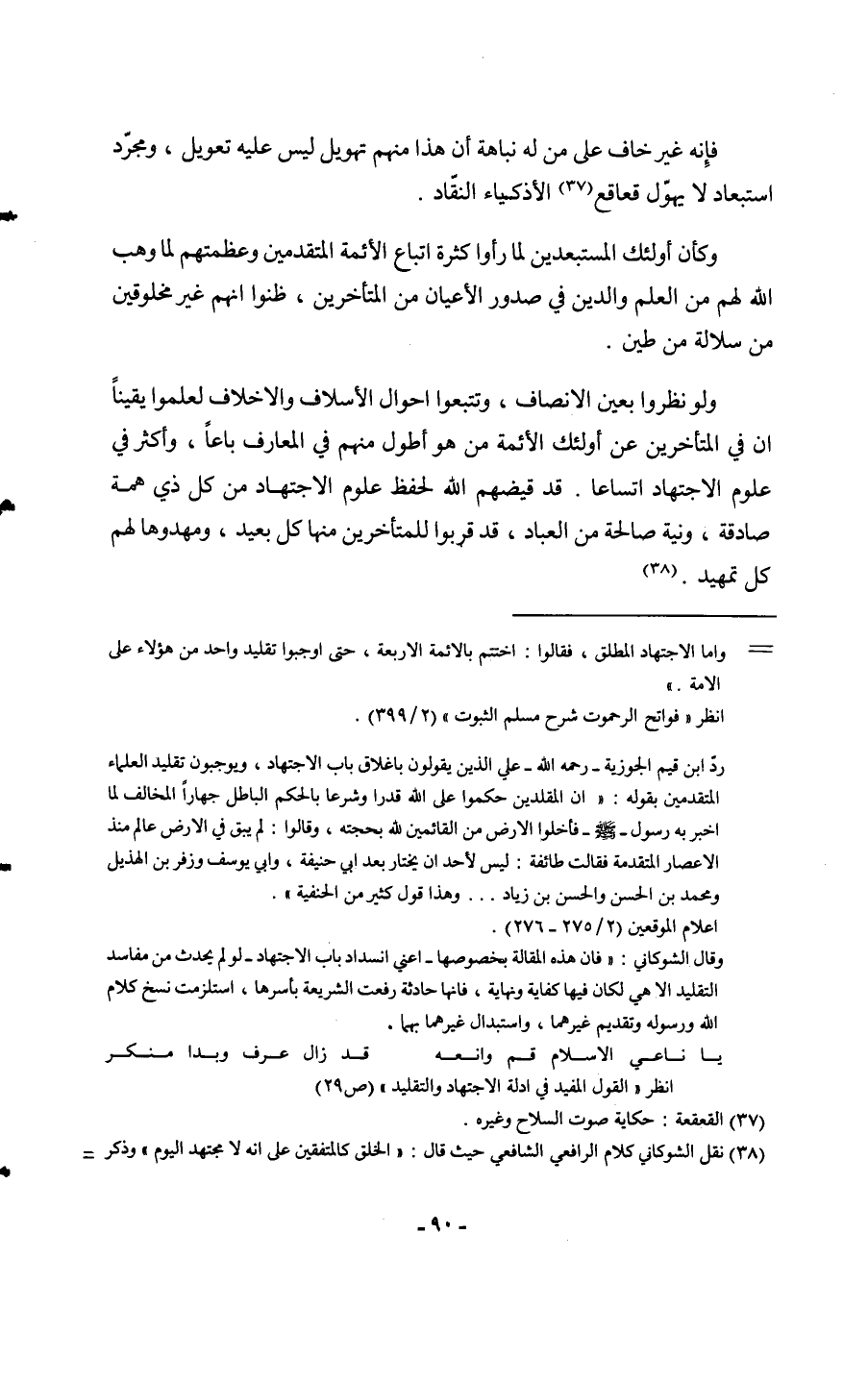 فَإِنَّهُ غير خَافَ على من لَهُ نباهة أَن هَذَا مِنْهُم تهويل لَيْسَ عَلَيْهِ تعويل وَمُجَرَّد استبعاد لَا يهول قعاقع الأذكياء النقاد وَكَأن أُولَئِكَ المستبعدين لما رَأَوْا كَثْرَة اتِّبَاع الْأَئِمَّة الْمُتَقَدِّمين وعظمتم لما وهب الله لَهُم من الْعلم وَالدّين فِي صُدُور الْأَعْيَان من الْمُتَأَخِّرين ظنُّوا أَنهم غير مخلوقين من سلالة من طين وَلَو نظرُوا بِعَين الْإِنْصَاف وتتبعوا أَحْوَال الأسلاف والأخلاف لعلموا يَقِينا إِن فِي الْمُتَأَخِّرين عَن أُولَئِكَ الْأَئِمَّة من هُوَ أطول مِنْهُم فِي المعارف باعا وَأكْثر فِي عُلُوم الِاجْتِهَاد اتساعا قد قيضهم الله لحفظ عُلُوم الِاجْتِهَاد من كل ذِي همة صَادِقَة وَنِيَّة صَالِحَة من الْعباد قد قربوا للمتأخرين مِنْهَا كل بعيد ومهدوها لَهُم كل تمهيد