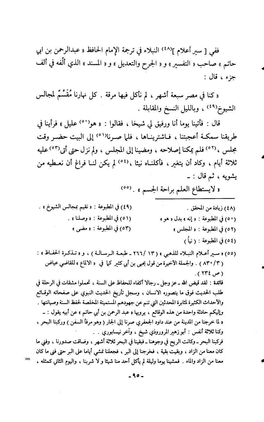 فَفِي سير أَعْلَام النبلاء فِي تَرْجَمَة الإِمَام الْحَافِظ عبد الرحمن بن أبي حَاتِم صَاحب التَّفْسِير وَالْجرْح وَالتَّعْدِيل والمسند الَّذِي أَلفه فِي ألف جُزْء قَالَ كُنَّا فِي مصر سَبْعَة أشهر لم نَأْكُل فِيهَا مرقة كل نهارنا مقسم لمجالس الشُّيُوخ وبالليل النّسخ والمقابلة قَالَ فأتينا يَوْمًا أَنا ورفيق لي شَيخا فَقَالُوا هُوَ عليل فَرَأَيْنَا فِي طريقنا سَمَكَة أعجبتنا فاشتريناها فَلَمَّا صرنا إِلَى الْبَيْت حضر وَقت مجْلِس فَلم يمكنا إِصْلَاحه ومضينا إِلَى الْمجْلس وَلم نزل حَتَّى أَتَى عَلَيْهِ ثَلَاثَة أَيَّام وَكَاد أَن يتَغَيَّر فأكلناه نيئا لم يكن لنا فرَاغ أَن نُعْطِيه من يشويه ثمَّ قَالَ لَا يُسْتَطَاع الْعلم براحة الْجِسْم
