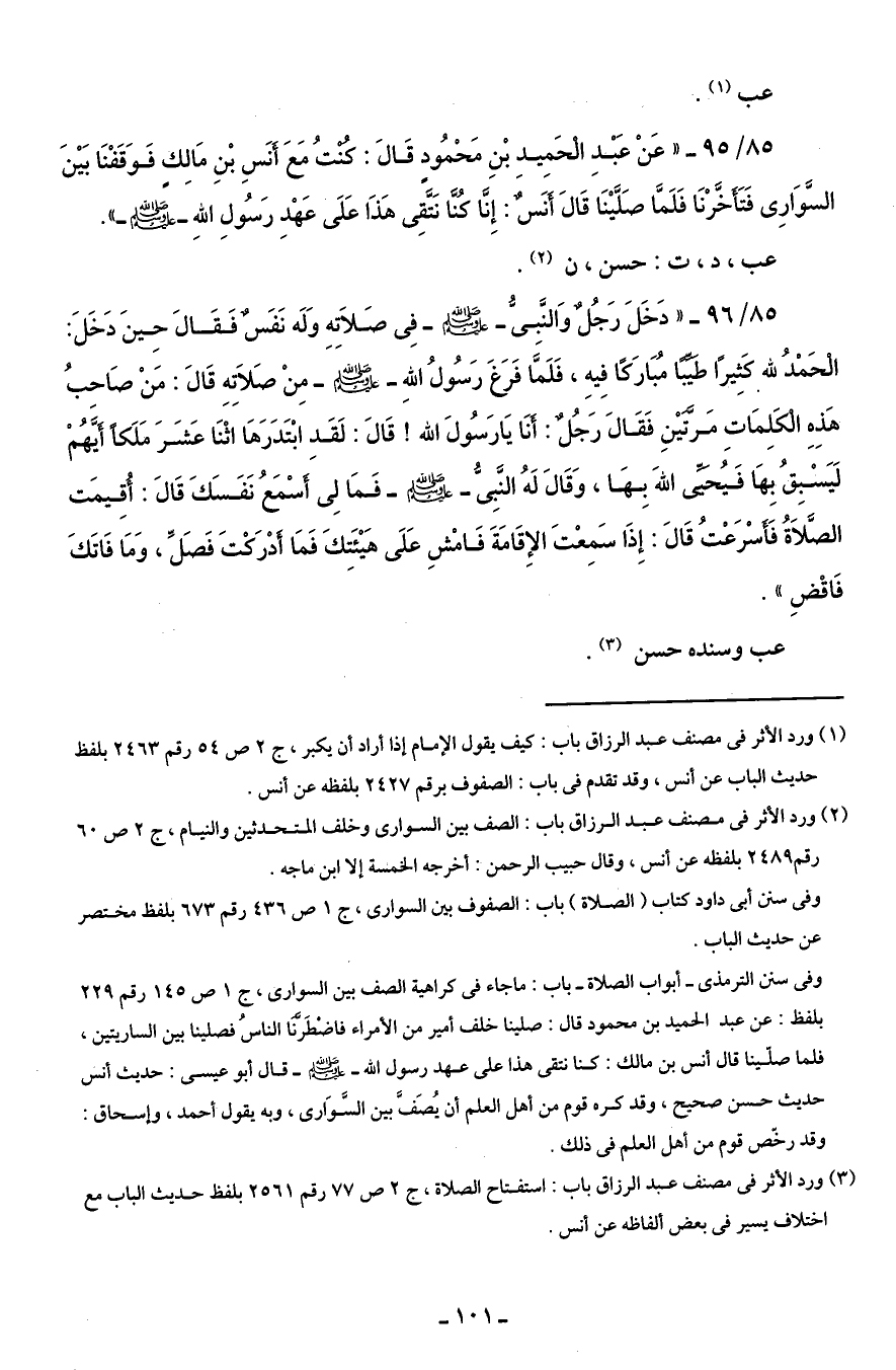 (¬2) ورد الأثر في مصنف عبد الرزاق باب: الصف بين السوارى وخلف المتحدثين والنيام، ج 2 ص 60 رقم 2489 بلفظه عن أنس، وقال حبيب الرحمن: أخرجه الخمسة إلا ابن ماجه.
