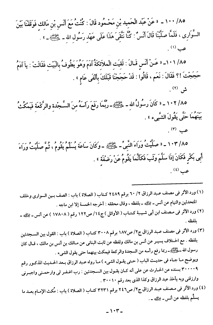 (¬3) ورد الأثر في مصنف عبد الرزاق ج 2/ ص 187 برقم 3008 كتاب (الصلاة) باب: القول بين السجدتين بلفظه. مع اختلاف يسير عن أنس بن مالك ولفظه عن ثابت البنانى عن مالك بن أنس بن مالك، قال كان رسول الله - صلى الله عليه وسلم - ربما رفع رأسه من السجدة والركعة فيمكث بينهما حتى يقول الشئ.