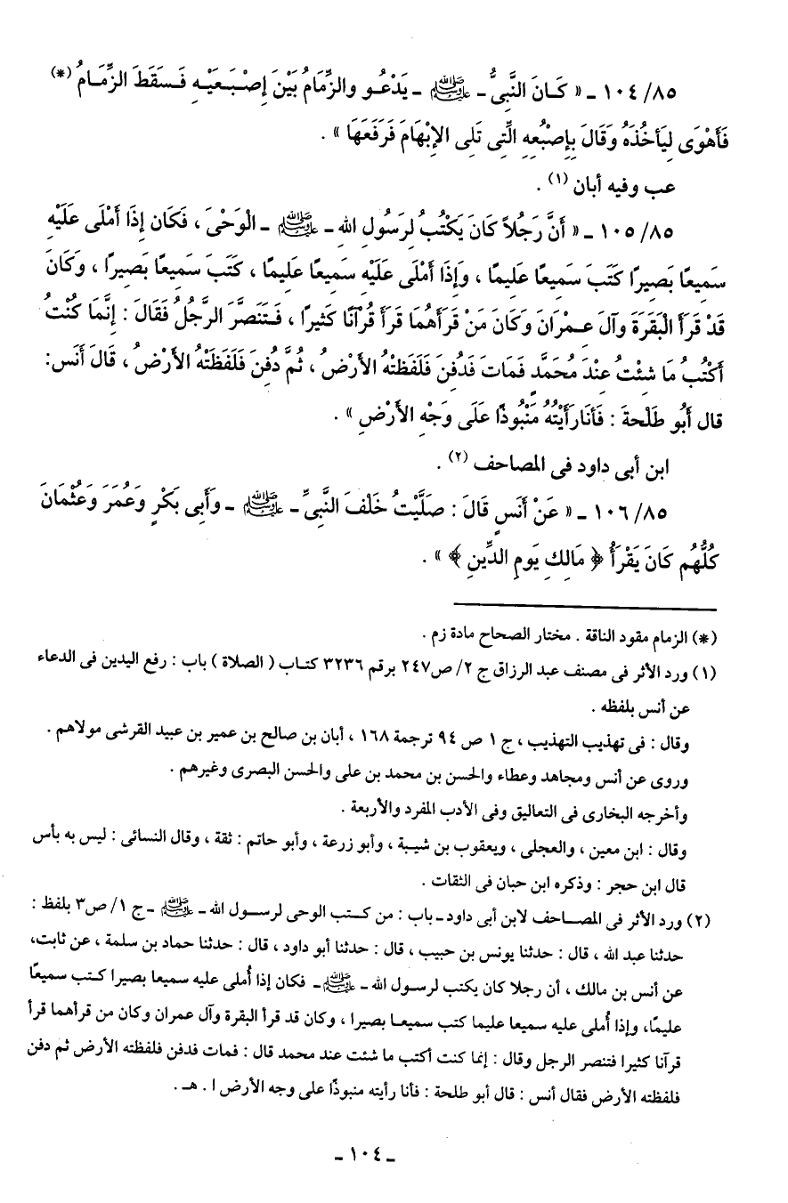 85/ 105 - "أن رَجُلا كَانَ يَكْتُبُ لِرَسُولِ اللهِ - صلى الله عليه وسلم - الوَحْىَ، فَكَان إِذَا أمْلَى عَلَيْهِ سَمِيعًا بَصيرًا كَتَبَ سَمِيعًا عَلِيمًا، وَإِذَا أمْلَى عَلَيْه سَمِيعًا عَلِيمًا، كَتَبَ سَمِيعًا بَصِيرًا، وَكَانَ قَدْ قَرَأ البَقَرَةَ وآلَ عِمْرَانَ وَكَانَ مَنْ قَرَأَهُمَا قَرَأَ قُرآنًا كَثيرًا، فَتَنَصَّرَ الرجُلُ فَقَالَ: إِنَّمَا كنتُ أَكْتُبُ مَا شئْتُ عِنْدَ مُحَمَّد فَمَاتَ فَدُفِنَ فَلَفَظتْهُ الأرْضُ، ثُمَّ دُفِنَ فَلَفَظَتْهُ الأرْضُ، قَالَ أَنَس: قال أبُو طَلحةَ: فَأنَا رَأَيْتُهُ مَنْبُوذًا عَلَى وَجْهِ الأرْضِ".